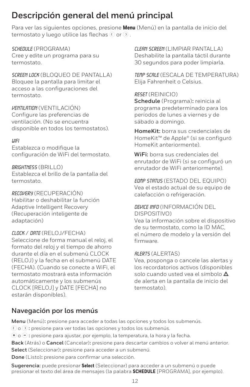 Vea, posponga o cancele las alertas y los recordatorios activos (disponibles solo cuando usted vea el símbolode alerta en la pantalla de inicio del termostato). Navegación por los menús Menu (Menú): presione para acceder a todas las opciones y todos los submenús. o : presione para ver todas las opciones y todos los submenús. o : presione para ajustar, por ejemplo, la temperatura, la hora y la fecha. Back (Atrás) o Cancel (Cancelar): presione para descartar cambios o volver al menú anterior. Select (Seleccionar): presione para acceder a un submenú. Done (Listo): presione para confirmar una selección. Sugerencia: puede presionar Select (Seleccionar) para acceder a un submenú o puede presionar el texto del área de mensajes (la palabra SCHEDULE [PROGRAMA], por ejemplo).