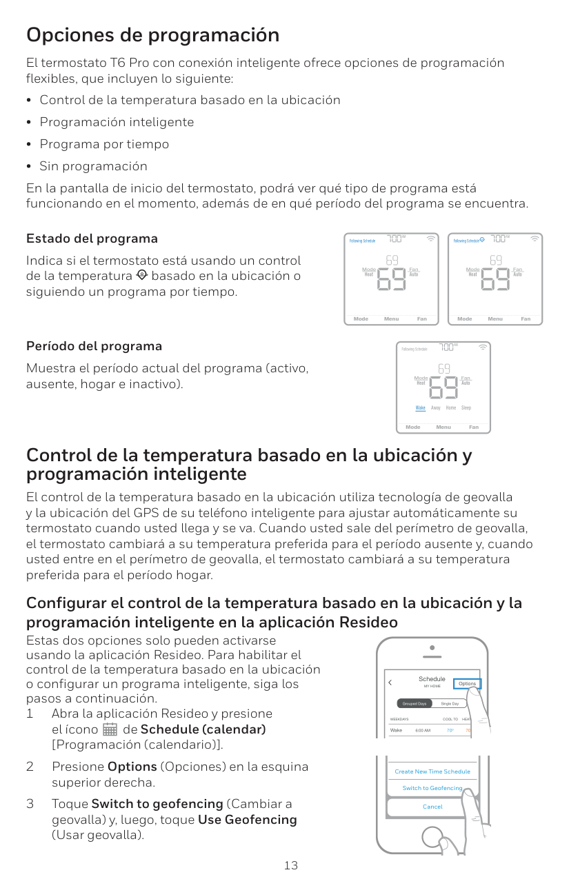 El termostato T6 Pro con conexión inteligente ofrece opciones de programación flexibles, que incluyen lo siguiente: