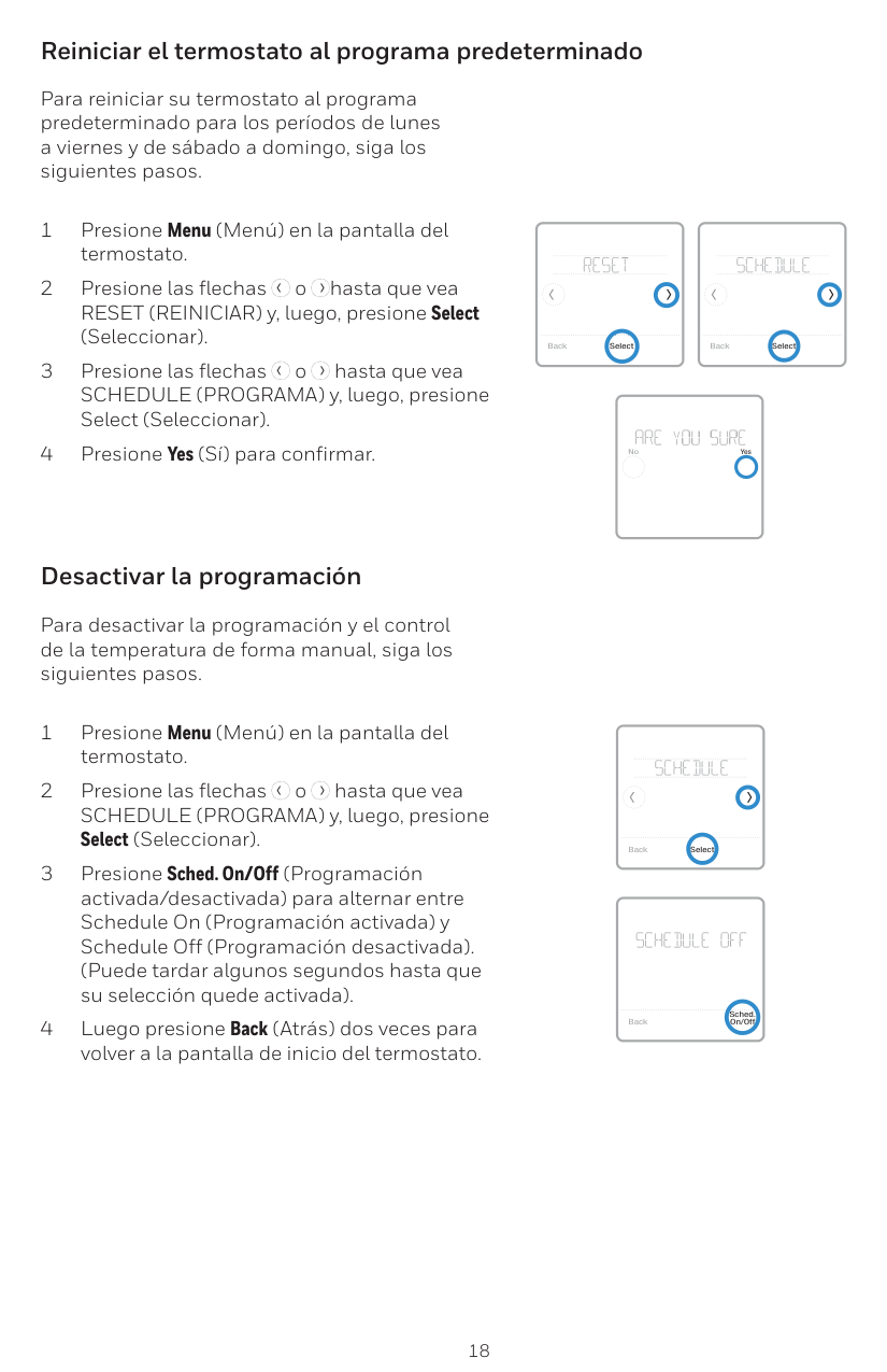 Reiniciar el termostato al programa predeterminado Back Select Back Sched. On/Off Back Select Back Select No Yes Para reiniciar su termostato al programa predeterminado para los períodos de lunes a viernes y de sábado a domingo, siga los siguientes pasos. 1 Presione Menu (Menú) en la pantalla del termostato. 2 Presione las flechas o hasta que vea RESET (REINICIAR) y, luego, presione Select (Seleccionar). 3 Presione las flechas o hasta que vea SCHEDULE (PROGRAMA) y, luego, presione Select (Seleccionar). 4 Presione Yes (Sí) para confirmar. Desactivar la programación Para desactivar la programación y el control de la temperatura de forma manual, siga los siguientes pasos. 1 Presione Menu (Menú) en la pantalla del termostato. 2 Presione las flechas o hasta que vea SCHEDULE (PROGRAMA) y, luego, presione Select (Seleccionar). 3 Presione Sched. On/Off (Programación activada/desactivada) para alternar entre Schedule On (Programación activada) y Schedule Off (Programación desactivada). (Puede tardar algunos segundos hasta que su selección quede activada). 4 Luego presione Back (Atrás) dos veces para volver a la pantalla de inicio del termostato.