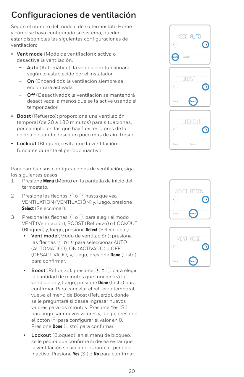 Según el número del modelo de su termostato Home y cómo se haya configurado su sistema, pueden estar disponibles las siguientes configuraciones de ventilación: