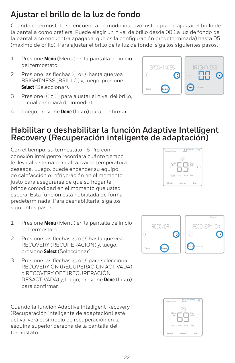 Cuando el termostato se encuentra en modo inactivo, usted puede ajustar el brillo de la pantalla como prefiera. Puede elegir un nivel de brillo desde 00 (la luz de fondo de la pantalla se encuentra apagada, que es la configuración predeterminada) hasta 05 (máximo de brillo). Para ajustar el brillo de la luz de fondo, siga los siguientes pasos. Ajustar el brillo de la luz de fondo Con el tiempo, su termostato T6 Pro con conexión inteligente recordará cuánto tiempo le lleva al sistema para alcanzar la temperatura deseada. Luego, puede encender su equipo de calefacción o refrigeración en el momento justo para asegurarse de que su hogar le brinde comodidad en el momento que usted espera. Esta función está habilitada de forma predeterminada. Para deshabilitarla, siga los siguientes pasos. 1 Presione Menu (Menú) en la pantalla de inicio del termostato. 2 Presione las flechas o hasta que vea RECOVERY (RECUPERACIÓN) y, luego, presione Select (Seleccionar). 3 Presione las flechas o para seleccionar