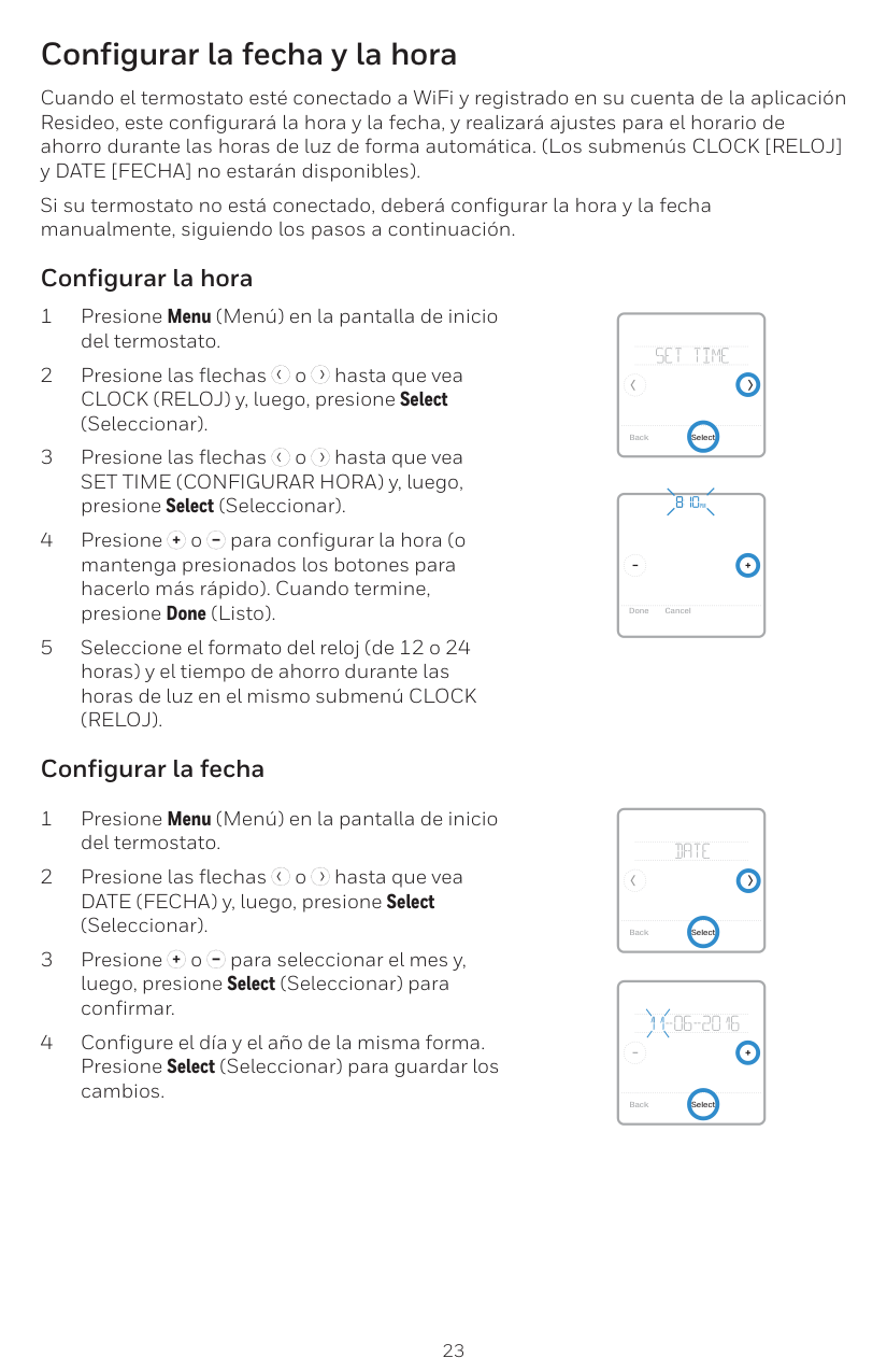 Cuando el termostato esté conectado a WiFi y registrado en su cuenta de la aplicación Resideo, este configurará la hora y la fecha, y realizará ajustes para el horario de ahorro durante las horas de luz de forma automática. (Los submenús CLOCK [RELOJ] y DATE [FECHA] no estarán disponibles). Si su termostato no está conectado, deberá configurar la hora y la fecha manualmente, siguiendo los pasos a continuación. Configurar la fecha y la hora Back Select