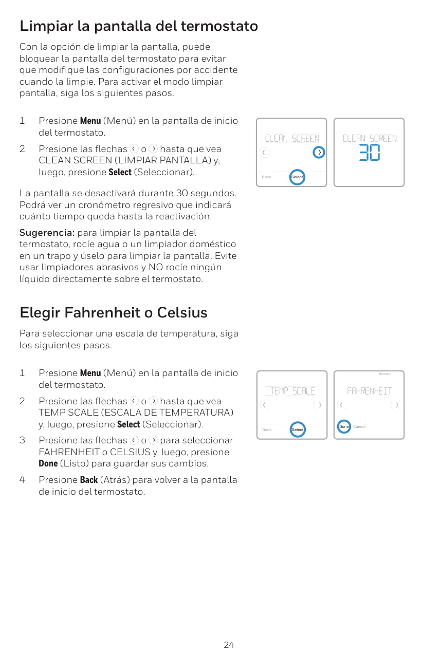 Con la opción de limpiar la pantalla, puede bloquear la pantalla del termostato para evitar que modifique las configuraciones por accidente cuando la limpie. Para activar el modo limpiar pantalla, siga los siguientes pasos. 1 Presione Menu (Menú) en la pantalla de inicio del termostato. 2 Presione las flechas o hasta que vea CLEAN SCREEN (LIMPIAR PANTALLA) y, luego, presione Select (Seleccionar). La pantalla se desactivará durante 30 segundos. Podrá ver un cronómetro regresivo que indicará cuánto tiempo queda hasta la reactivación. Sugerencia: para limpiar la pantalla del termostato, rocíe agua o un limpiador doméstico en un trapo y úselo para limpiar la pantalla. Evite usar limpiadores abrasivos y NO rocíe ningún líquido directamente sobre el termostato. Limpiar la pantalla del termostato Para seleccionar una escala de temperatura, siga los siguientes pasos. 1 Presione Menu (Menú) en la pantalla de inicio del termostato. 2 Presione las flechas o hasta que vea