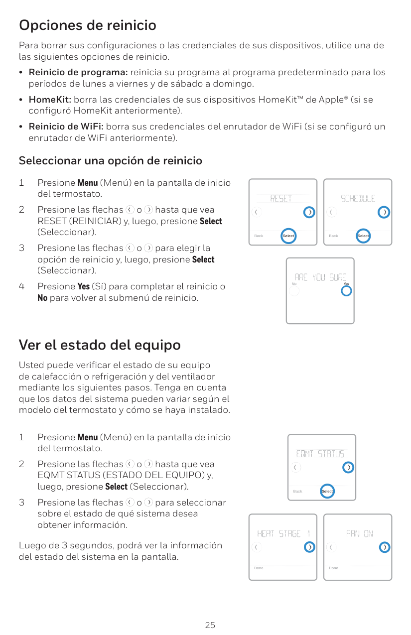 Schedule (Programa): reinicia al programa predeterminado para los períodos de lunes a viernes y de sábado a domingo. HomeKit: borra sus credenciales de HomeKit™ de Apple® (si se configuró HomeKit anteriormente). WiFi: borra sus credenciales del enrutador de WiFi (si se configuró un enrutador de WiFi anteriormente).Eqmp Status (Estado Del Equipo)