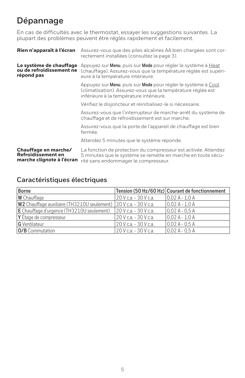 5 En cas de difficultés avec le thermostat, essayer les suggestions suivantes. La plupart des problèmes peuvent être réglés rapidement et facilement. Rien n’apparaît à l’écran Assurez-vous que des piles alcalines AA bien chargées sont cor rectement installées (consultez la page 3). Le système de chauffage ou de refroidissement ne répond pas Appuyez sur Menu, puis sur Mode pour régler le système à Heat (chauffage). Assurez-vous que la température réglée est supéri eure à la température intérieure. Appuyez sur Menu, puis sur Mode pour régler le système à Cool (climatisation). Assurez-vous que la température réglée est inférieure à la température intérieure. Vérifiez le disjoncteur et réinitialisez-le si nécessaire. Assurez-vous que l’interrupteur de marche-arrêt du système de chauffage et de refroidissement est sur marche. Assurez-vous que la porte de l’appareil de chauffage est bien fermée. Attendez 5 minutes que le système réponde. Chauffage en marche/ Refroidissement en marche clignote à l’écran La fonction de protection du compresseur est activée. Attendez 5 minutes que le système se remette en marche en toute sécu rité sans endommager le compresseur. Dépannage Caractéristiques électriques Borne Tension (50 Hz/60 Hz) Courant de fonctionnement W Chauffage 20 V c.a. - 30 V c.a.