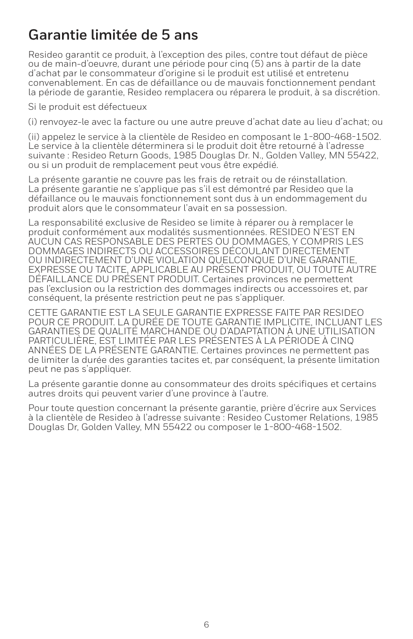 6 Resideo garantit ce produit, à l’exception des piles, contre tout défaut de pièce ou de main-d’oeuvre, durant une période pour cinq (5) ans à partir de la date d’achat par le consommateur d’origine si le produit est utilisé et entretenu convenablement. En cas de défaillance ou de mauvais fonctionnement pendant la période de garantie, Resideo remplacera ou réparera le produit, à sa discrétion. Si le produit est défectueux (i) renvoyez-le avec la facture ou une autre preuve d’achat date au lieu d’achat; ou (ii) appelez le service à la clientèle de Resideo en composant le 1-800-468-1502. Le service à la clientèle déterminera si le produit doit être retourné à l’adresse suivante : Resideo Return Goods, 1985 Douglas Dr. N., Golden Valley, MN 55422, ou si un produit de remplacement peut vous être expédié. La présente garantie ne couvre pas les frais de retrait ou de réinstallation. La présente garantie ne s’applique pas s’il est démontré par Resideo que la défaillance ou le mauvais fonctionnement sont dus à un endommagement du produit alors que le consommateur l’avait en sa possession. La responsabilité exclusive de Resideo se limite à réparer ou à remplacer le produit conformément aux modalités susmentionnées. RESIDEO N’EST EN