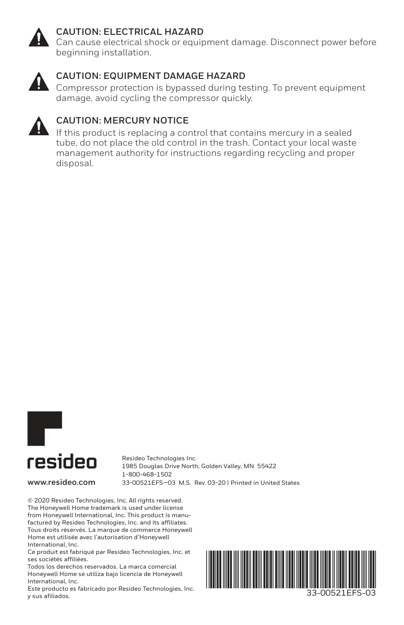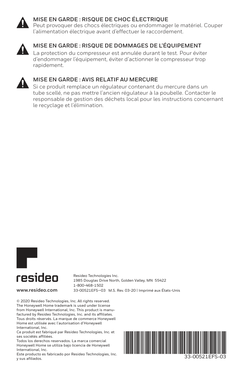 Resideo Technologies Inc. 1985 Douglas Drive North, Golden Valley, MN 55422 1-800-468-1502 33-00521EFS—03 M.S. Rev. 03-20 | Imprimé aux États-UnisMise En Garde : Avis Relatif Au Mercure