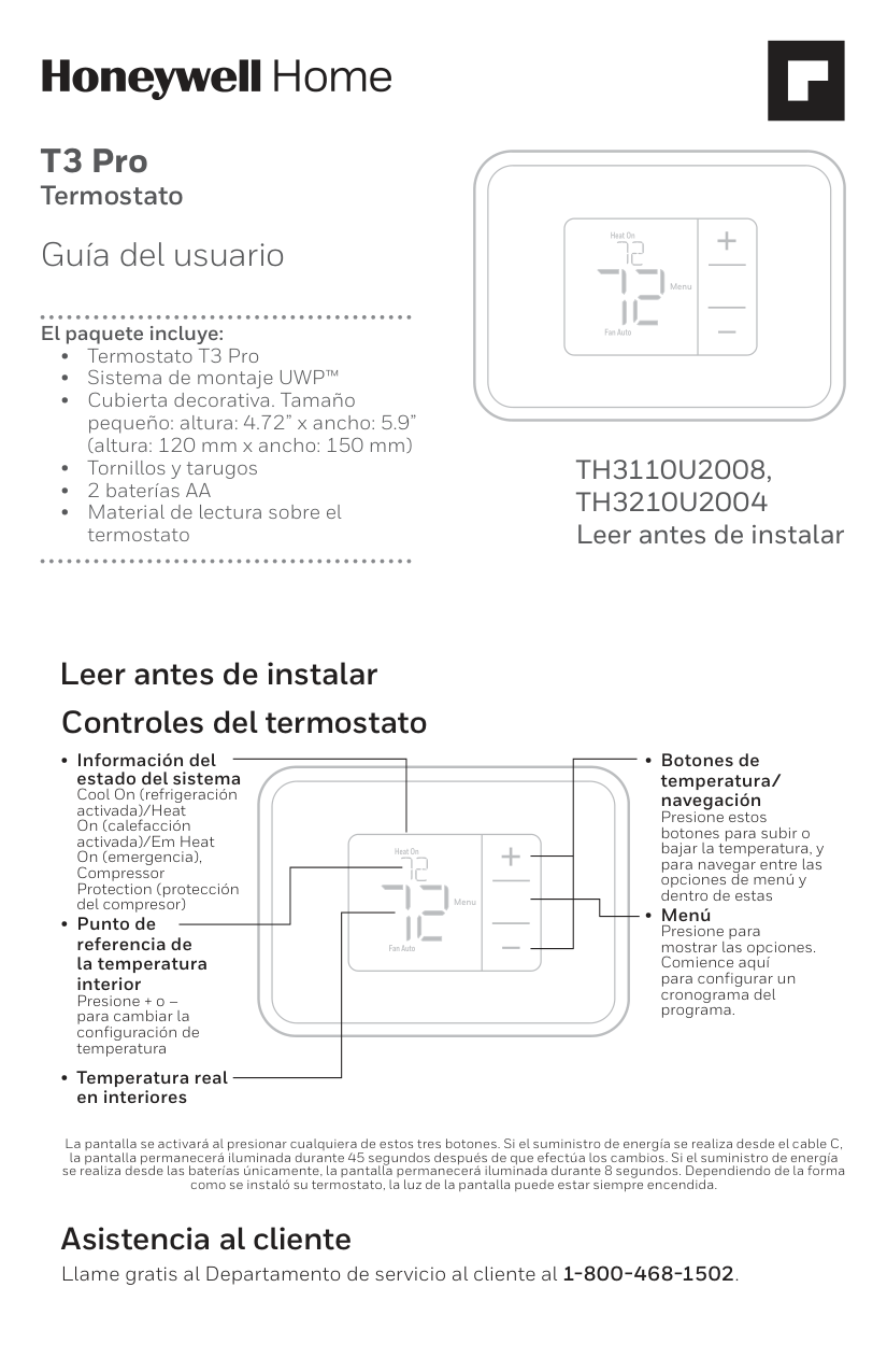 Leer antes de instalar Heat On Menu Fan Auto T3 Pro Termostato Guía del usuario El paquete incluye:2
