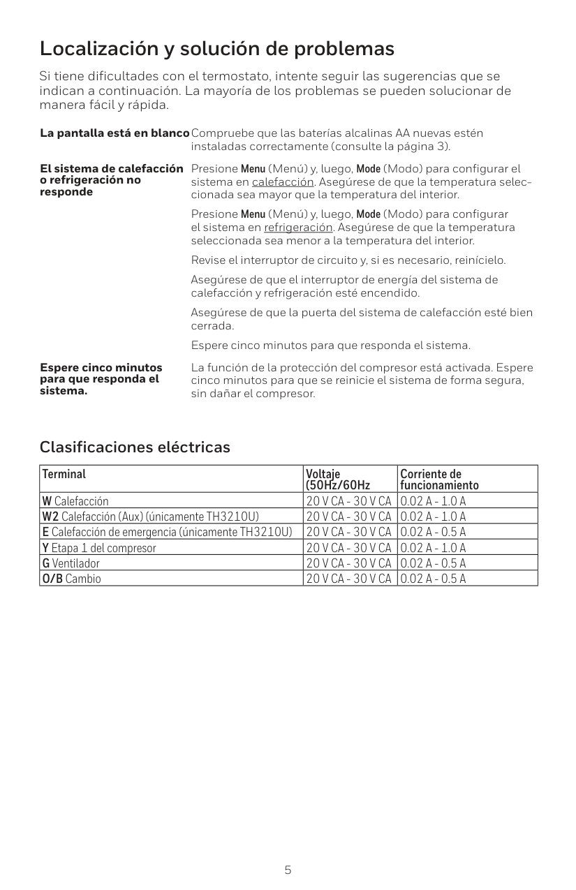 5 Si tiene dificultades con el termostato, intente seguir las sugerencias que se indican a continuación. La mayoría de los problemas se pueden solucionar de manera fácil y rápida. La pantalla está en blanco Compruebe que las baterías alcalinas AA nuevas estén instaladas correctamente (consulte la página 3). El sistema de calefacción o refrigeración no responde Presione Menu (Menú) y, luego, Mode (Modo) para configurar el sistema en calefacción. Asegúrese de que la temperatura selec cionada sea mayor que la temperatura del interior. Presione Menu (Menú) y, luego, Mode (Modo) para configurar el sistema en refrigeración. Asegúrese de que la temperatura seleccionada sea menor a la temperatura del interior. Revise el interruptor de circuito y, si es necesario, reinícielo. Asegúrese de que el interruptor de energía del sistema de calefacción y refrigeración esté encendido. Asegúrese de que la puerta del sistema de calefacción esté bien cerrada. Espere cinco minutos para que responda el sistema. Espere cinco minutos para que responda el sistema. La función de la protección del compresor está activada. Espere cinco minutos para que se reinicie el sistema de forma segura, sin dañar el compresor. Localización y solución de problemas Clasificaciones eléctricas Terminal Voltaje (50Hz/60Hz Corriente de funcionamiento W Calefacción