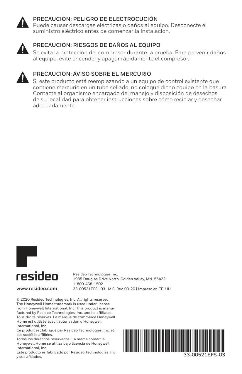 WARRANTY. Some states do not allow limitations on how long an implied warranty lasts, so the above limitation may not apply to you. This warranty gives you specific legal rights, and you may have other rights which vary from state to state. If you have any questions concerning this warranty, please write Resideo Customer Care, 1985 Douglas Dr, Golden Valley, MN 55422 or call 1-800-468-1502. 5-year limited warrantyResideo Technologies Inc. 1985 Douglas Drive North, Golden Valley, MN 55422 1-800-468-1502 33-00521EFS—03 M.S. Rev. 03-20 | Printed in United States www.resideo.com © 2020 Resideo Technologies, Inc. All rights reserved. The Honeywell Home trademark is used under license from Honeywell International, Inc. This product is manu- factured by Resideo Technologies, Inc. and its affiliates. Tous droits réservés. La marque de commerce Honeywell Home est utilisée avec l’autorisation d’Honeywell International, Inc. Ce produit est fabriqué par Resideo Technologies, Inc. et ses sociétés affiliées. Todos los derechos reservados. La marca comercial Honeywell Home se utiliza bajo licencia de Honeywell International, Inc. Este producto es fabricado por Resideo Technologies, Inc. y sus afiliados.