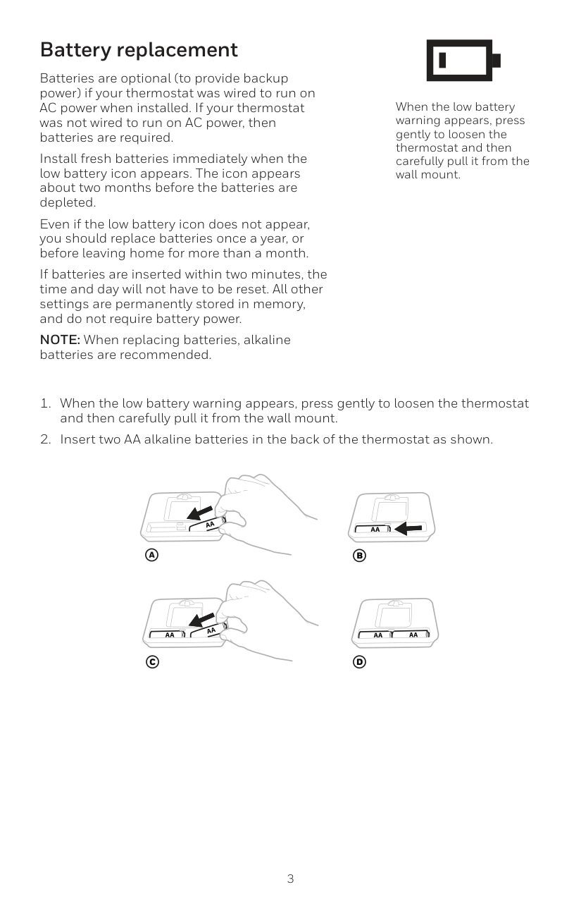 3 Batteries are optional (to provide backup power) if your thermostat was wired to run on AC power when installed. If your thermostat was not wired to run on AC power, then batteries are required. Install fresh batteries immediately when the low battery icon appears. The icon appears about two months before the batteries are depleted. Even if the low battery icon does not appear, you should replace batteries once a year, or before leaving home for more than a month. If batteries are inserted within two minutes, the time and day will not have to be reset. All other settings are permanently stored in memory, and do not require battery power. NOTE: When replacing batteries, alkaline batteries are recommended. Battery replacement When the low battery warning appears, press gently to loosen the thermostat and then carefully pull it from the wall mount.