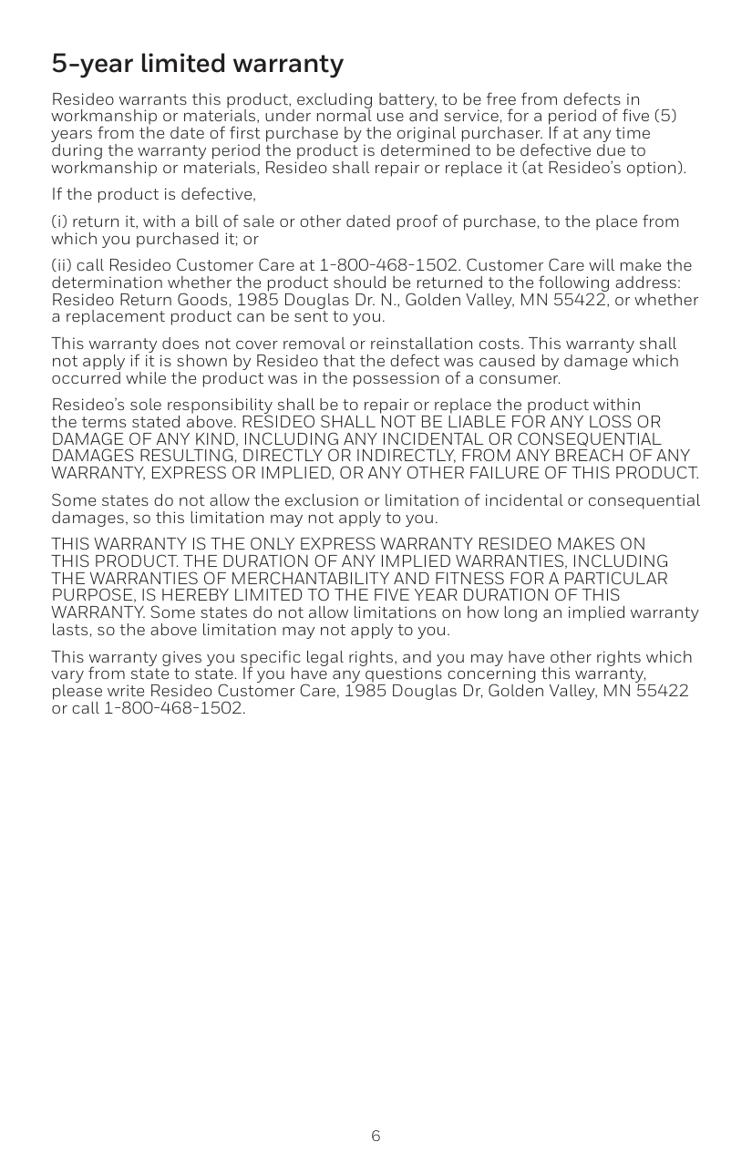 6 Resideo warrants this product, excluding battery, to be free from defects in workmanship or materials, under normal use and service, for a period of five (5) years from the date of first purchase by the original purchaser. If at any time during the warranty period the product is determined to be defective due to workmanship or materials, Resideo shall repair or replace it (at Resideo’s option). If the product is defective, (i) return it, with a bill of sale or other dated proof of purchase, to the place from which you purchased it; or (ii) call Resideo Customer Care at 1-800-468-1502. Customer Care will make the determination whether the product should be returned to the following address: Resideo Return Goods, 1985 Douglas Dr. N., Golden Valley, MN 55422, or whether a replacement product can be sent to you. This warranty does not cover removal or reinstallation costs. This warranty shall not apply if it is shown by Resideo that the defect was caused by damage which occurred while the product was in the possession of a consumer. Resideo’s sole responsibility shall be to repair or replace the product within the terms stated above. RESIDEO SHALL NOT BE LIABLE FOR ANY LOSS OR