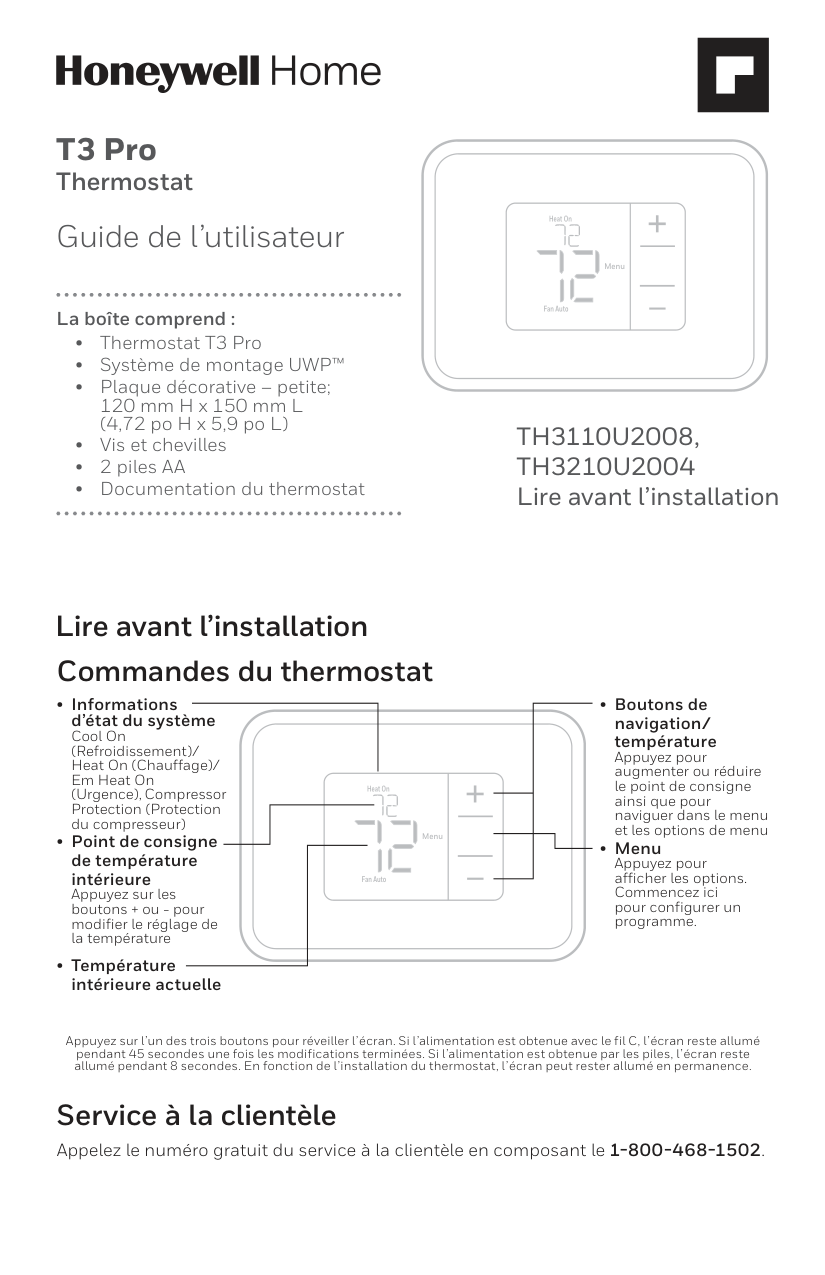 Lire avant l’installation T3 Pro Thermostat Guide de l’utilisateur La boîte comprend :2 Réglages pour le fonctionnement du système