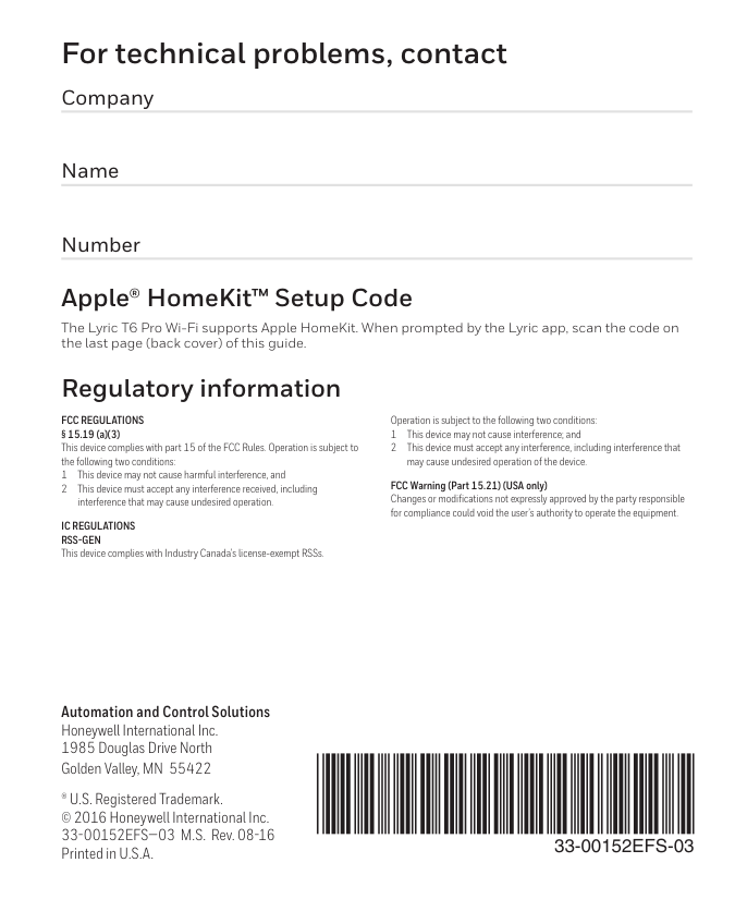 Some states do not allow limitations on how long an implied warranty lasts, so the above limitation may not apply to you. This warranty gives you specific legal rights, and you may have other rights which vary from state to state. If you have any questions concerning this warranty, please write Honeywell Customer Relations, 1985 Douglas Dr, Golden Valley, MN 55422 or call 1-800-468-1502. 5-year limited warrantyHome and Building Technologies In the U.S.: Honeywell 1985 Douglas Drive North Golden Valley, MN 55422-3992 http://yourhome.honeywell.com ® U.S. Registered Trademark. © 2017 Honeywell International Inc.