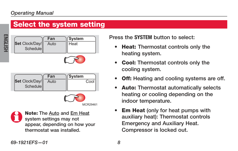 Note: The Auto and Em Heat system settings may not appear, depending on how your thermostat was installed. Press the SYSTEM button to select:Mcr29461