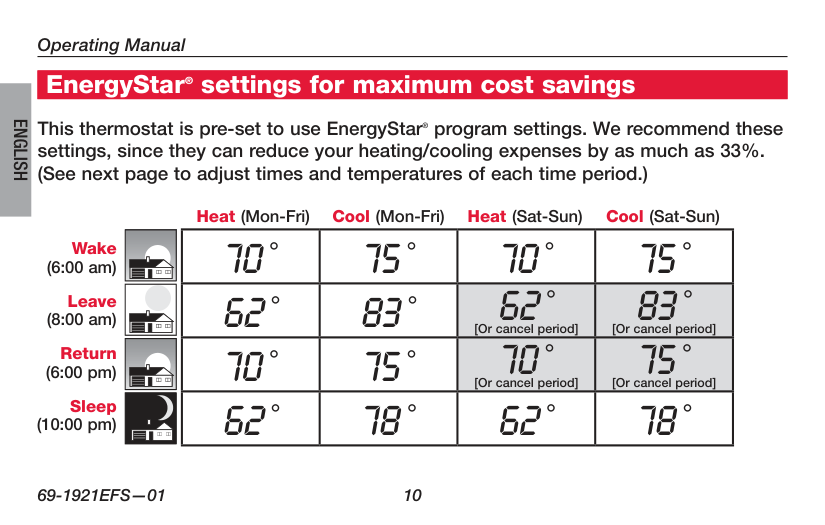 Honeywell recommends the following EnergyStar settings for maximum energy savings: Wake (6:00 am) at 70°F for heat and 75°F for cooling, Leave (8:00 am) at 62°F for heat and 83°F for cooling, Return (6:00 pm) at 70°F for heat and 75°F for cooling, and Sleep (10:00 pm) at 62°F for heat and 78°F for cooling. These settings can reduce heating and cooling expenses by up to 33%.