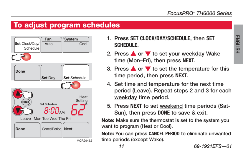 Note: If the display flashes Set Clock, the thermostat will follow your settings for the weekday “Wake” time period until you reset the time and day. Set the time and day Press SET CLOCK/DAY/SCHEDULE, then adjust time Press SET DAY, then select current dayFocusPRO ® TH6000 Series