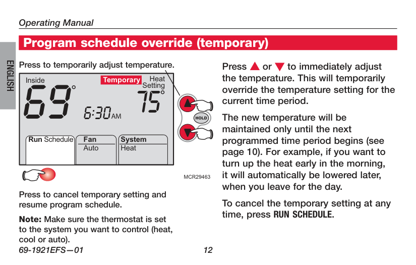 To temporarily adjust the temperature, press the up or down arrow buttons to immediately change the setting. This will temporarily override the temperature for the current period only. The temperature will automatically revert to the programmed setting when the next time period begins. To cancel the temporary setting at any time, press RUN SCHEDULE.