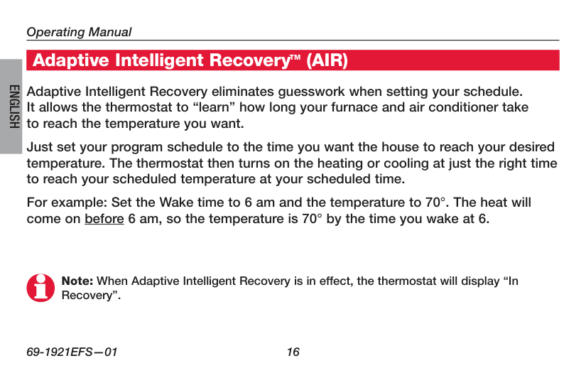 Nota: Cuando la función “Adaptive Intelligent Recovery” (recuperación inteligente de adaptación) esté activada, el termostato mostrará en la pantalla la frase “In Recovery”. Adaptive Intelligent Recovery™ (AIR) La función Adaptive Intelligent Recovery elimina la necesidad de conjeturas cuando se configure un cronograma. Permite que el termostato “sepa” cuánto demora su sistema de calefacción eléctrico para alcanzar la temperatura deseada. Sólo configure el cronograma del programa con la hora que desee que la casa alcance la temperatura deseada. El termostato, luego, encenderá la calefacción o el sistema de enfriamiento en el momento indicado para alcanzar esa temperatura y la hora programada por usted. Por ejemplo, configure la hora para despertarse a las 6 a. m. y con una temperatura de 70º. El calor volverá antes de las 6 a. m., para que la temperatura esté a 70º para cuando se levante a las 6.Serie FocusPRO