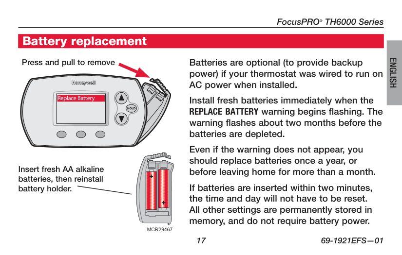 Battery Holder Press down and pull to remove batteries. Batteries should be replaced once a year (see page 17). This manual covers the following models: TH6110D: For 1 Heat/1 Cool systems TH6220D: For up to 2 Heat/2 Cool systems TH6320U: For up to 3 Heat/2 Cool systems (Remove battery holder to find model number)FocusPRO ® TH6000 Series