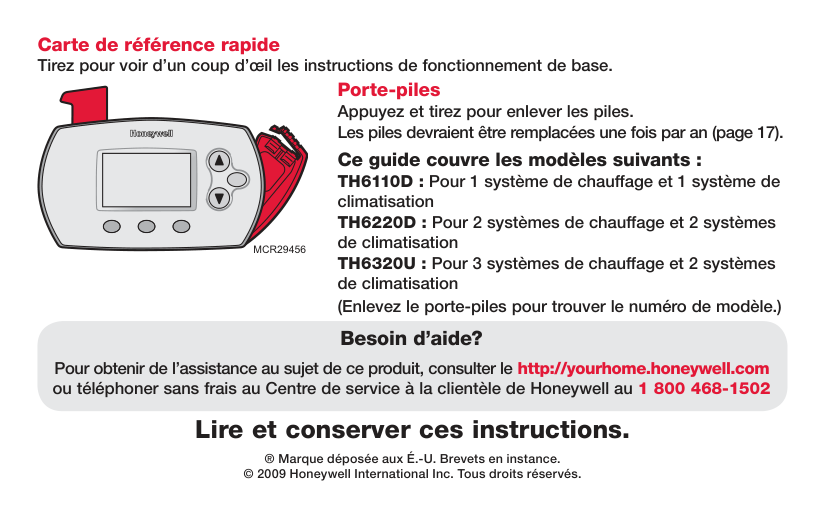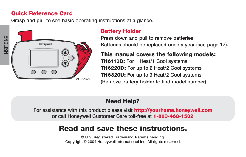 Read and save these instructions. ® U.S. Registered Trademark. Patents pending. Copyright © 2009 Honeywell International Inc. All rights reserved. Quick Reference Card Grasp and pull to see basic operating instructions at a glance. Need Help? For assistance with this product please visit http://yourhome.honeywell.com or call Honeywell Customer Care toll-free at 1-800-468-1502Mcr29456