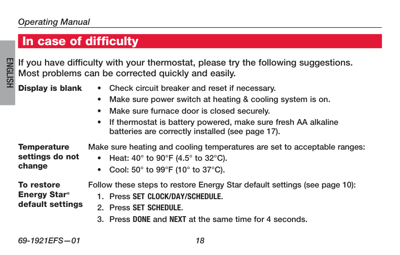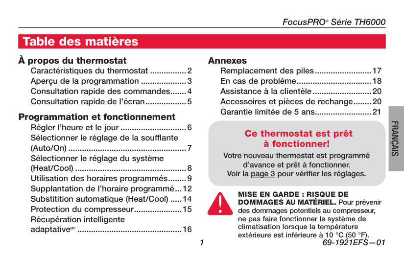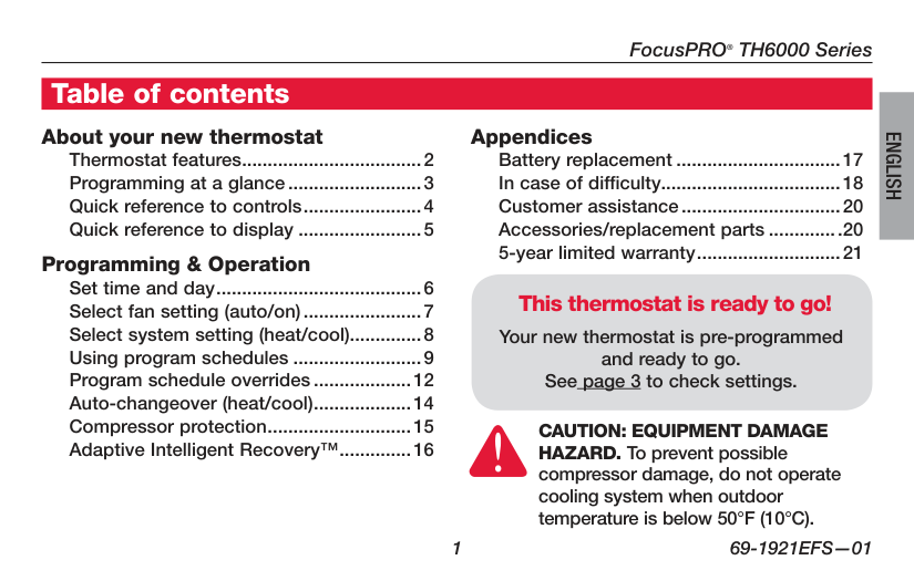 About your new thermostat Thermostat features....................................2 Programming at a glance...........................3 Quick reference to controls........................4 Quick reference to display.........................5 Programming & Operation Set time and day.........................................6 Select fan setting (auto/on)........................7 Select system setting (heat/cool)..............8 Using program schedules..........................9 Program schedule overrides....................12 Auto-changeover (heat/cool)....................14 Compressor protection.............................15 Adaptive Intelligent Recovery™...............16 Appendices Battery replacement.................................17 In case of difficulty...................................18 Customer assistance................................20 Accessories/replacement parts...............20 5-year limited warranty.............................21 This thermostat is ready to go! Your new thermostat is pre-programmed and ready to go. See page 3 to check settings. Table of contentsCaution: Equipment Damage