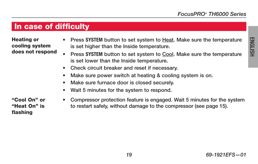 En cas de problème Si le thermostat cause des ennuis, essayer l’une de ces suggestions. La plupart des problèmes peuvent être réglés rapidement et facilement. L’écran est videFocusPRO ® Série TH6000
