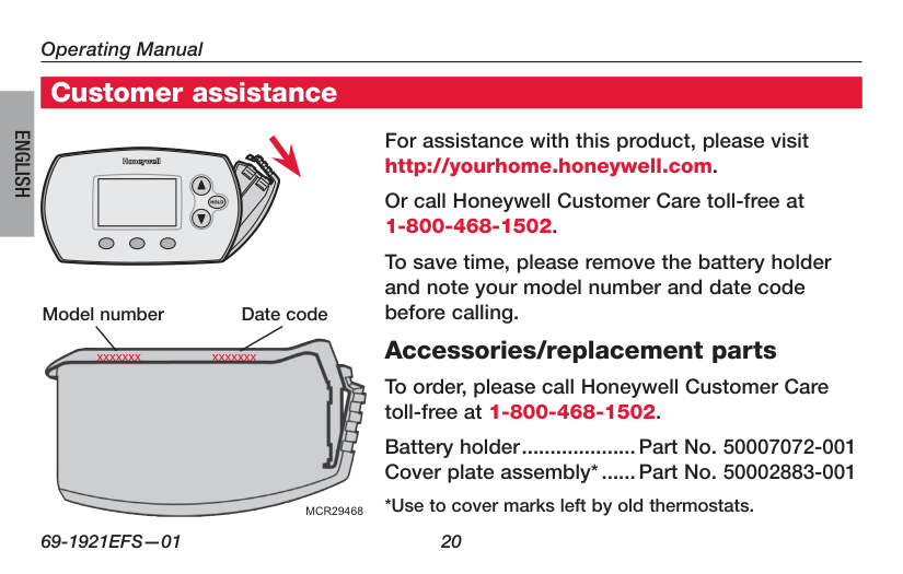 Para obtener asistencia relacionada con este producto, visite http://yourhome.honeywell.com. Para hacer el pedido, comuníquese con el número gratuito de Atención al cliente de Honeywell 1-800-468-1502. Para ahorrar tiempo, anote el número de modelo y el código de fecha antes de llamar. Accesorios y piezas de repuesto Para hacer el pedido, comuníquese con el número gratuito de Atención al cliente de Honeywell 1-800-468-1502. Soporte de la batería.............N.º de pieza 50007072-001 Ensamblaje de la placa de cubierta*............................N.º de pieza 50002883-001 *Úselo para cubrir las marcas que dejan los termostatos viejos. Número de modelo Código de la fecha Ayuda al clienteSerie FocusPRO