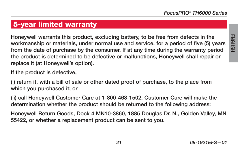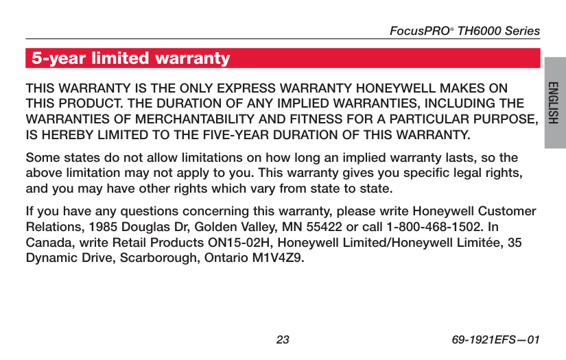 Garantie limitée de 5 ans Honeywell garantit ce produit, à l’exception des piles, contre tout défaut de pièce ou de main-d’oeuvre, durant une période de cinq (5) ans à partir de la date d’achat si le produit est utilisé et entretenu convenablement. Si, à n’importe quel moment de la période de garantie, le produit est défectueux, Honeywell le réparera ou le remplacera (à sa discrétion). En cas de défectuosité du produit, (i) le retourner, avec le reçu d’achat ou une autre preuve d’achat datée, à l’endroit où il a été acheté, ou (ii) téléphoner au Centre de service à la clientèle de Honeywell au 1 800 468-1502. Le Centre décidera alors s’il faut retourner le produit à l’adresse suivante : Honeywell Return Goods, Dock 4 MN10-3860, 1885 Douglas Dr. N, Golden Valley, MN 55422, ou s’il vous fera parvenir un produit de remplacement.Manuel d’utilisation