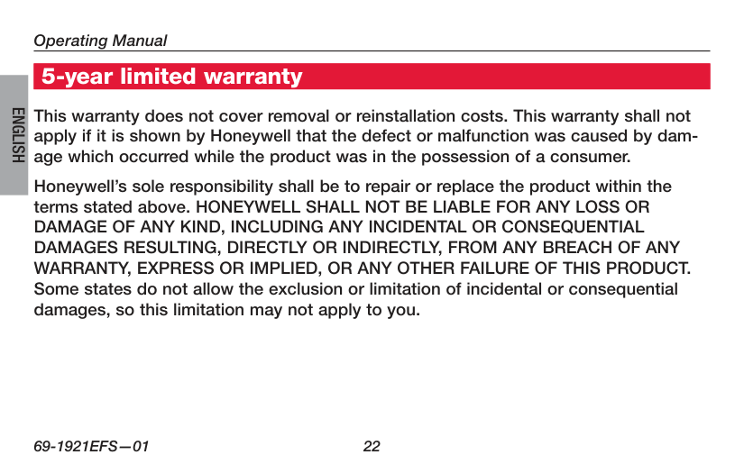Garantía limitada de 5 años Esta garantía no cubre los costos de extracción o reinstalación. Esta garantía no se aplicará si Honeywell demuestra que el defecto o mal funcionamiento estaba causado por daños ocurridos mientras el producto estaba en posesión de un consumidor. La única responsabilidad de Honeywell será reparar o reemplazar el producto dentro de los plazos establecidos anteriormente. HONEYWELL NO RESPONDERÁPor La Pérdida O Daño De Ningún Tipo, Incluido El Daño Incidental