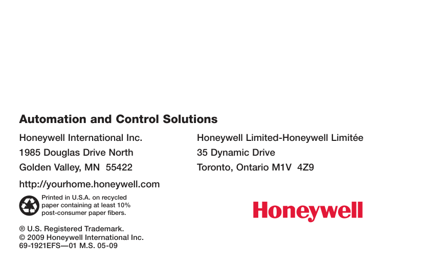 Honeywell International Inc. 1985 Douglas Drive North Golden Valley, MN 55422 http://yourhome.honeywell.com Honeywell Limited-Honeywell Limitée 35 Dynamic Drive Toronto (Ontario) M1V 4Z9 ® Marque déposée aux É.-U. © 2009 Honeywell International Inc.