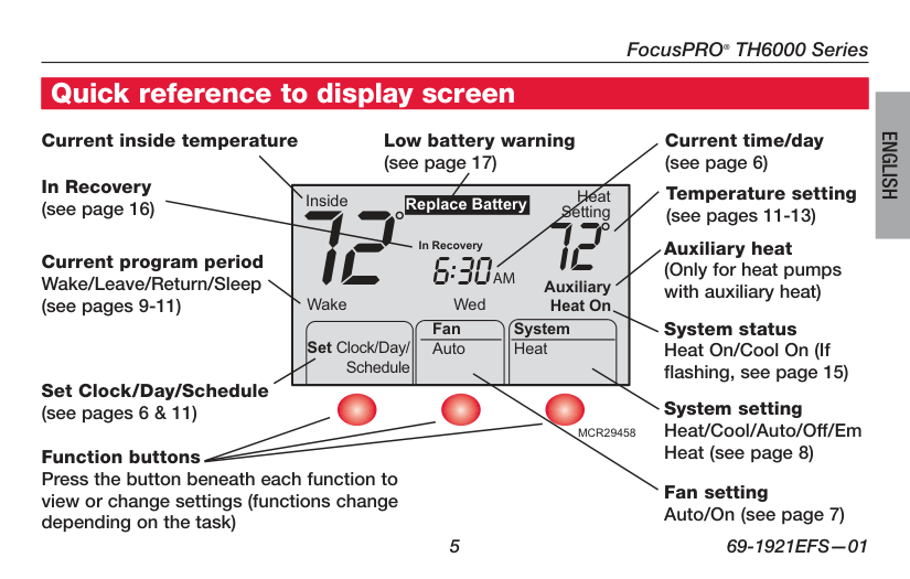 Current inside temperature In Recovery (see page 16) Current program period Wake/Leave/Return/Sleep (see pages 9-11) Set Clock/Day/Schedule (see pages 6 & 11) Function buttons Press the button beneath each function to view or change settings (functions change depending on the task) Low battery warning (see page 17) Current time/day (see page 6) Temperature setting (see pages 11-13) Auxiliary heat (Only for heat pumps with auxiliary heat) System status Heat On/Cool On (If flashing, see page 15) System setting Heat/Cool/Auto/Off/Em Heat (see page 8) Fan setting Auto/On (see page 7) Quick reference to display screenOperating Manual