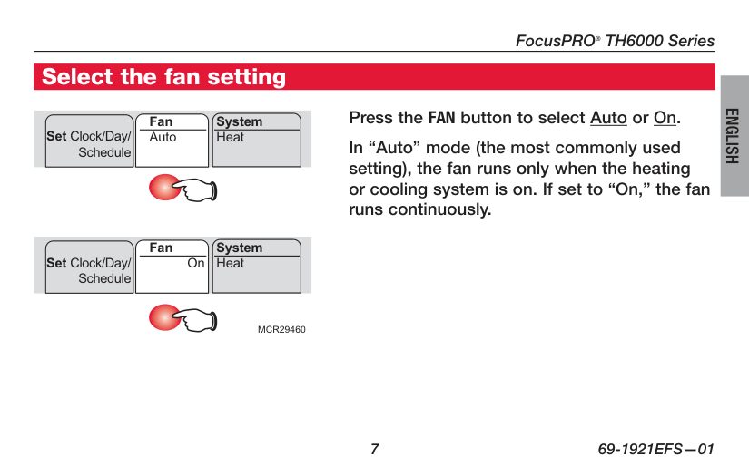 Press the FAN button to select Auto or On. In “Auto” mode (the most commonly used setting), the fan runs only when the heating or cooling system is on. If set to “On,” the fan runs continuously. Select the fan setting Set Clock/Day/ Schedule Auto Fan System Heat Set Clock/Day/ Schedule On Fan System HeatMcr29460