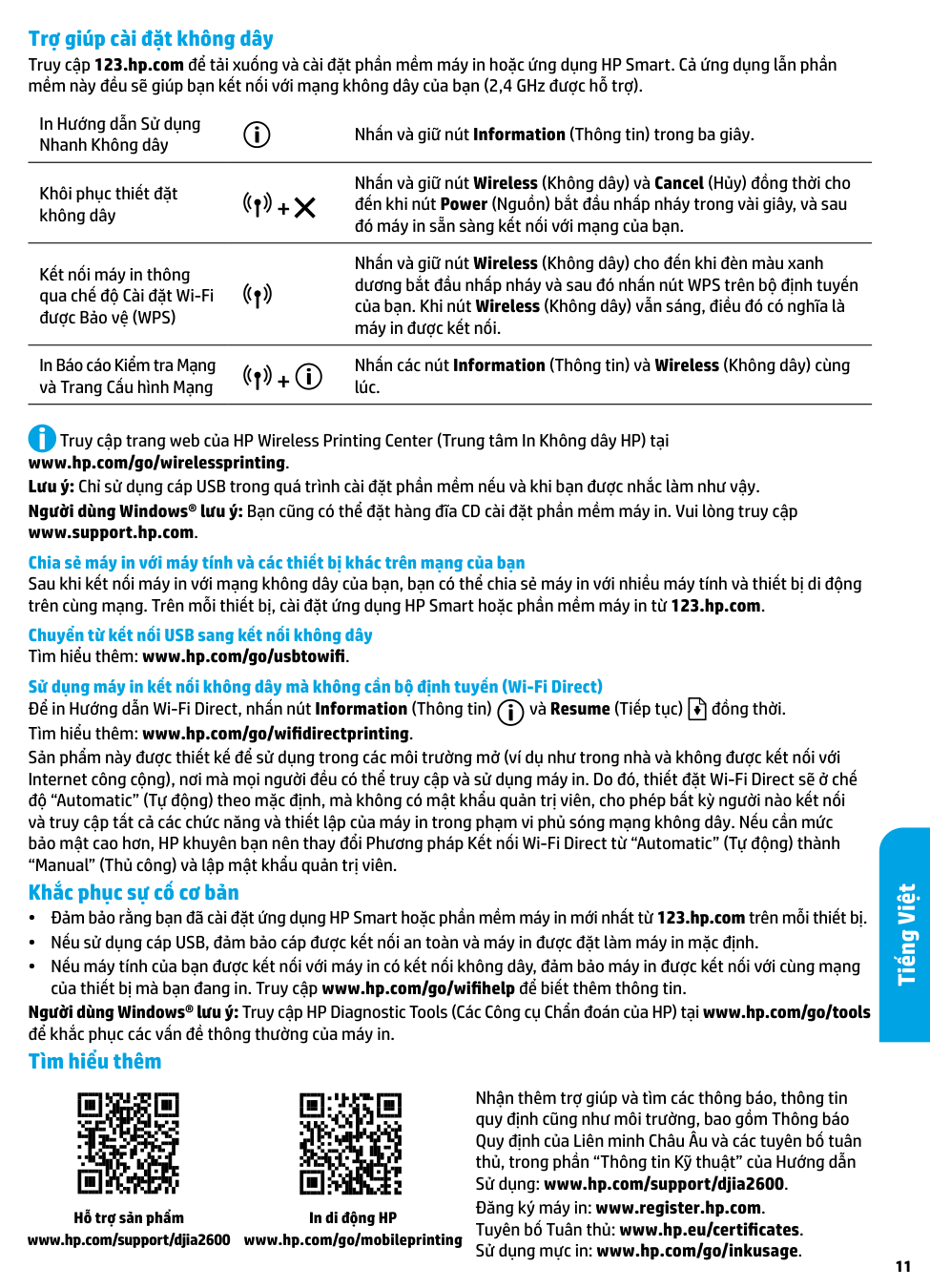 11 Trợ giúp cài đặt không dây Truy cập 123.hp.com để tải xuống và cài đặt phần mềm máy in hoặc ứng dụng HP Smart. Cả ứng dụng lẫn phần mềm này đều sẽ giúp bạn kết nối với mạng không dây của bạn (2,4 GHz được hỗ trợ). In Hướng dẫn Sử dụng Nhanh Không dây Nhấn và giữ nút Information (Thông tin) trong ba giây. Khôi phục thiết đặt không dây + Nhấn và giữ nút Wireless (Không dây) và Cancel (Hủy) đồng thời cho đến khi nút Power (Nguồn) bắt đầu nhấp nháy trong vài giây, và sau đó máy in sẵn sàng kết nối với mạng của bạn. Kết nối máy in thông qua chế độ Cài đặt Wi-Fi được Bảo vệ (WPS) Nhấn và giữ nút Wireless (Không dây) cho đến khi đèn màu xanh dương bắt đầu nhấp nháy và sau đó nhấn nút WPS trên bộ định tuyến của bạn. Khi nút Wireless (Không dây) vẫn sáng, điều đó có nghĩa là máy in được kết nối. In Báo cáo Kiểm tra Mạng và Trang Cấu hình Mạng + Nhấn các nút Information (Thông tin) và Wireless (Không dây) cùng lúc. Truy cập trang web của HP Wireless Printing Center (Trung tâm In Không dây HP) tại www.hp.com/go/wirelessprinting. Lưu ý: Chỉ sử dụng cáp USB trong quá trình cài đặt phần mềm nếu và khi bạn được nhắc làm như vậy. Người dùng Windows® lưu ý: Bạn cũng có thể đặt hàng đĩa CD cài đặt phần mềm máy in. Vui lòng truy cập www.support.hp.com. Chia sẻ máy in với máy tính và các thiết bị khác trên mạng của bạn Sau khi kết nối máy in với mạng không dây của bạn, bạn có thể chia sẻ máy in với nhiều máy tính và thiết bị di động trên cùng mạng. Trên mỗi thiết bị, cài đặt ứng dụng HP Smart hoặc phần mềm máy in từ 123.hp.com. Chuyển từ kết nối USB sang kết nối không dây Tìm hiểu thêm: www.hp.com/go/usbtowifi. Sử dụng máy in kết nối không dây mà không cần bộ định tuyến (Wi-Fi Direct) Để in Hướng dẫn Wi-Fi Direct, nhấn nút Information (Thông tin) và Resume (Tiếp tục) đồng thời. Tìm hiểu thêm: www.hp.com/go/wifidirectprinting. Sản phẩm này được thiết kế để sử dụng trong các môi trường mở (ví dụ như trong nhà và không được kết nối với Internet công cộng), nơi mà mọi người đều có thể truy cập và sử dụng máy in. Do đó, thiết đặt Wi-Fi Direct sẽ ở chế độ “Automatic” (Tự động) theo mặc định, mà không có mật khẩu quản trị viên, cho phép bất kỳ người nào kết nối và truy cập tất cả các chức năng và thiết lập của máy in trong phạm vi phủ sóng mạng không dây. Nếu cần mức bảo mật cao hơn, HP khuyên bạn nên thay đổi Phương pháp Kết nối Wi-Fi Direct từ “Automatic” (Tự động) thành “Manual” (Thủ công) và lập mật khẩu quản trị viên. Khắc phục sự cố cơ bản •• Đảm bảo rằng bạn đã cài đặt ứng dụng HP Smart hoặc phần mềm máy in mới nhất từ 123.hp.com trên mỗi thiết bị. •• Nếu sử dụng cáp USB, đảm bảo cáp được kết nối an toàn và máy in được đặt làm máy in mặc định. •• Nếu máy tính của bạn được kết nối với máy in có kết nối không dây, đảm bảo máy in được kết nối với cùng mạng của thiết bị mà bạn đang in. Truy cập www.hp.com/go/wifihelp để biết thêm thông tin. Người dùng Windows® lưu ý: Truy cập HP Diagnostic Tools (Các Công cụ Chẩn đoán của HP) tại www.hp.com/go/tools để khắc phục các vấn đề thông thường của máy in. Tìm hiểu thêm Nhận thêm trợ giúp và tìm các thông báo, thông tin quy định cũng như môi trường, bao gồm Thông báo Quy định của Liên minh Châu Âu và các tuyên bố tuân thủ, trong phần “Thông tin Kỹ thuật” của Hướng dẫn Sử dụng: www.hp.com/support/djia2600. Đăng ký máy in: www.register.hp.com. Tuyên bố Tuân thủ: www.hp.eu/certificates. Sử dụng mực in: www.hp.com/go/inkusage. In di động HP www.hp.com/go/mobileprinting Hỗ trợ sản phẩm www.hp.com/support/djia2600 Tiếng Việt