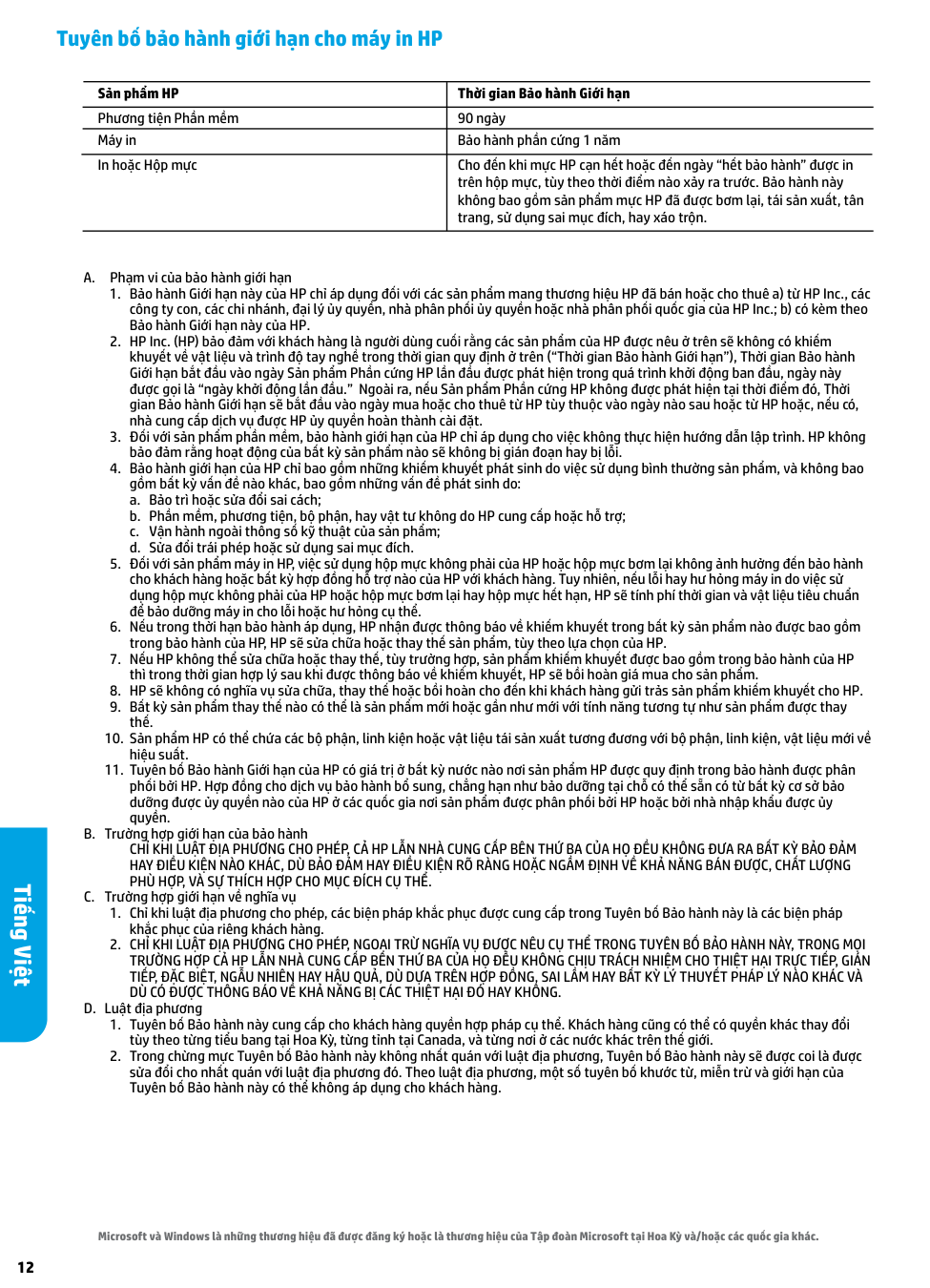 12 Tuyên bố bảo hành giới hạn cho máy in HP Microsoft và Windows là những thương hiệu đã được đăng ký hoặc là thương hiệu của Tập đoàn Microsoft tại Hoa Kỳ và/hoặc các quốc gia khác. A. Phạm vi của bảo hành giới hạn