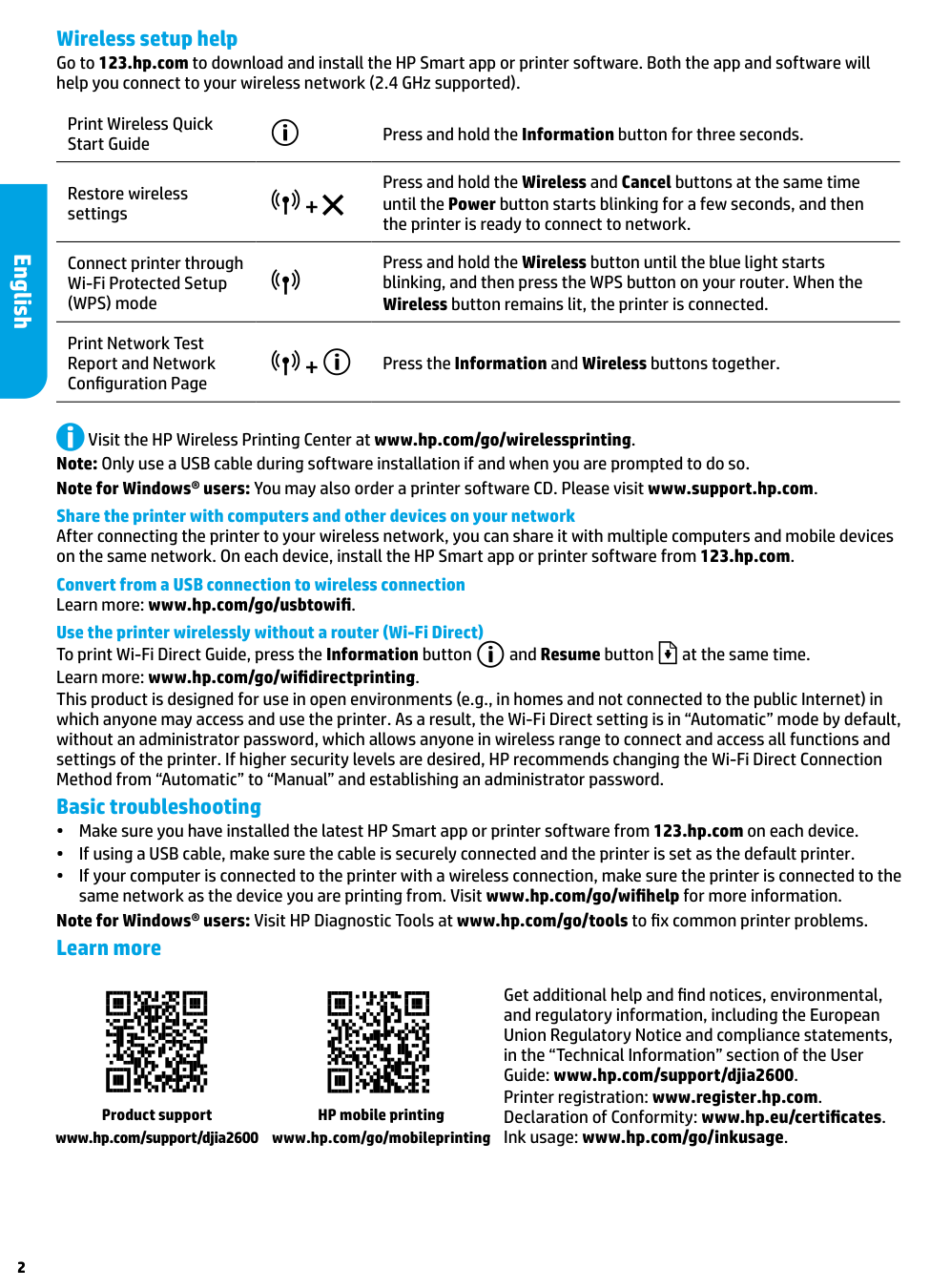 2 Wireless setup help Go to 123.hp.com to download and install the HP Smart app or printer software. Both the app and software will help you connect to your wireless network (2.4 GHz supported). Visit the HP Wireless Printing Center at www.hp.com/go/wirelessprinting. Note: Only use a USB cable during software installation if and when you are prompted to do so. Note for Windows® users: You may also order a printer software CD. Please visit www.support.hp.com. Share the printer with computers and other devices on your network After connecting the printer to your wireless network, you can share it with multiple computers and mobile devices on the same network. On each device, install the HP Smart app or printer software from 123.hp.com. Convert from a USB connection to wireless connection Learn more: www.hp.com/go/usbtowifi. Use the printer wirelessly without a router (Wi-Fi Direct) To print Wi-Fi Direct Guide, press the Information button and Resume button at the same time. Learn more: www.hp.com/go/wifidirectprinting. This product is designed for use in open environments (e.g., in homes and not connected to the public Internet) in which anyone may access and use the printer. As a result, the Wi-Fi Direct setting is in “Automatic” mode by default, without an administrator password, which allows anyone in wireless range to connect and access all functions and settings of the printer. If higher security levels are desired, HP recommends changing the Wi-Fi Direct Connection Method from “Automatic” to “Manual” and establishing an administrator password. Basic troubleshooting •• Make sure you have installed the latest HP Smart app or printer software from 123.hp.com on each device. •• If using a USB cable, make sure the cable is securely connected and the printer is set as the default printer. •• If your computer is connected to the printer with a wireless connection, make sure the printer is connected to the same network as the device you are printing from. Visit www.hp.com/go/wifihelp for more information. Note for Windows® users: Visit HP Diagnostic Tools at www.hp.com/go/tools to fix common printer problems. Learn more Get additional help and find notices, environmental, and regulatory information, including the European Union Regulatory Notice and compliance statements, in the “Technical Information” section of the User Guide: www.hp.com/support/djia2600. Printer registration: www.register.hp.com. Declaration of Conformity: www.hp.eu/certificates. Ink usage: www.hp.com/go/inkusage. HP mobile printing www.hp.com/go/mobileprinting Product support www.hp.com/support/djia2600 Print Wireless Quick Start Guide Press and hold the Information button for three seconds. Restore wireless settings + Press and hold the Wireless and Cancel buttons at the same time until the Power button starts blinking for a few seconds, and then the printer is ready to connect to network. Connect printer through Wi-Fi Protected Setup (WPS) mode Press and hold the Wireless button until the blue light starts blinking, and then press the WPS button on your router. When the Wireless button remains lit, the printer is connected. Print Network Test Report and Network Configuration Page + Press the Information and Wireless buttons together. English