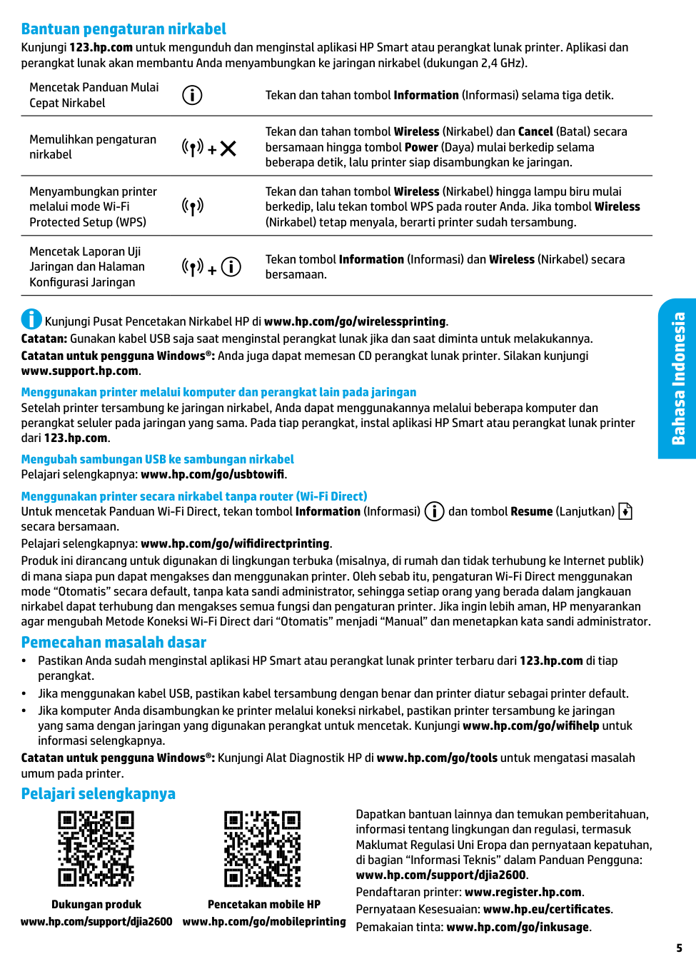 secara bersamaan. Pelajari selengkapnya: www.hp.com/go/wifidirectprinting. Produk ini dirancang untuk digunakan di lingkungan terbuka (misalnya, di rumah dan tidak terhubung ke Internet publik) di mana siapa pun dapat mengakses dan menggunakan printer. Oleh sebab itu, pengaturan Wi-Fi Direct menggunakan mode “Otomatis” secara default, tanpa kata sandi administrator, sehingga setiap orang yang berada dalam jangkauan nirkabel dapat terhubung dan mengakses semua fungsi dan pengaturan printer. Jika ingin lebih aman, HP menyarankan agar mengubah Metode Koneksi Wi-Fi Direct dari “Otomatis” menjadi “Manual” dan menetapkan kata sandi administrator. Pemecahan masalah dasar •• Pastikan Anda sudah menginstal aplikasi HP Smart atau perangkat lunak printer terbaru dari 123.hp.com di tiap perangkat. •• Jika menggunakan kabel USB, pastikan kabel tersambung dengan benar dan printer diatur sebagai printer default. •• Jika komputer Anda disambungkan ke printer melalui koneksi nirkabel, pastikan printer tersambung ke jaringan yang sama dengan jaringan yang digunakan perangkat untuk mencetak. Kunjungi www.hp.com/go/wifihelp untuk informasi selengkapnya. Catatan untuk pengguna Windows®: Kunjungi Alat Diagnostik HP di www.hp.com/go/tools untuk mengatasi masalah umum pada printer. Pelajari selengkapnya Dapatkan bantuan lainnya dan temukan pemberitahuan, informasi tentang lingkungan dan regulasi, termasuk Maklumat Regulasi Uni Eropa dan pernyataan kepatuhan, di bagian “Informasi Teknis” dalam Panduan Pengguna: www.hp.com/support/djia2600. Pendaftaran printer: www.register.hp.com. Pernyataan Kesesuaian: www.hp.eu/certificates. Pemakaian tinta: www.hp.com/go/inkusage. Pencetakan mobile HP www.hp.com/go/mobileprinting Dukungan produk www.hp.com/support/djia2600 Bahasa Indonesia