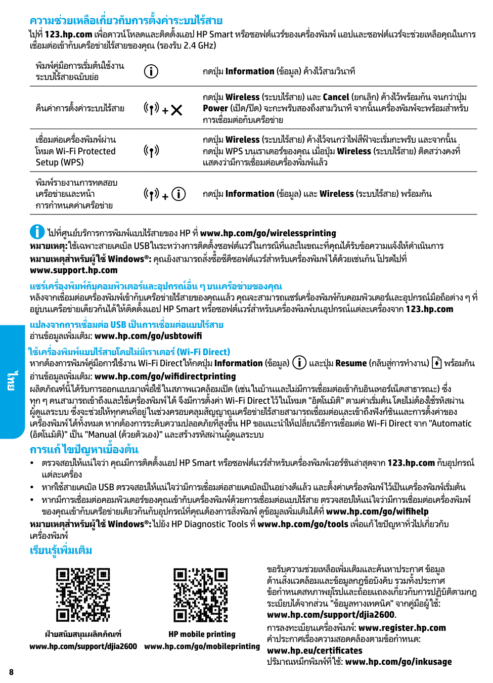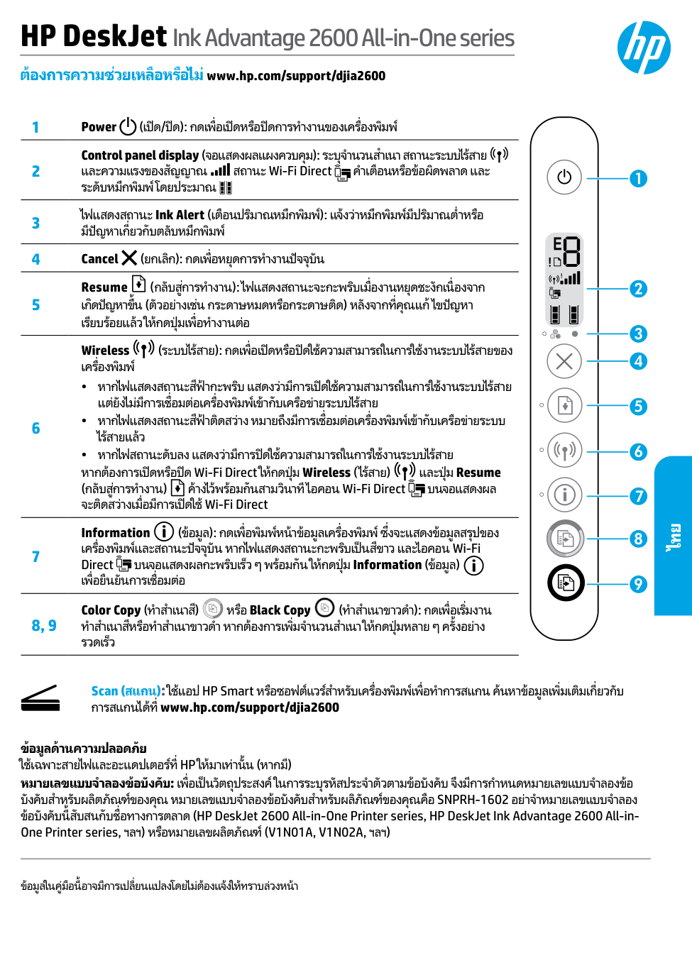 หมายเลขแบบจɅำลองข้อบังคับ: เพื่อเป็นวัตถุประสงค์ในการระบุรหัสประจɅำตัวตามข้อบังคับ จึงมีการกɅำหนดหมายเลขแบบจɅำลองข้อ บังคับสɅำหรับผลิตภัณฑ์ของคุณ หมายเลขแบบจɅำลองข้อบังคับสɅำหรับผลิภัณฑ์ของคุณคือ SNPRH-1602 อย่าจɅำหมายเลขแบบจɅำลอง ข้อบังคับนี้สับสนกับชื่อทางการตลาด (HP DeskJet 2600 All-in-One Printer series, HP DeskJet Ink Advantage 2600 All-in- One Printer series, ฯลฯ) หรือหมายเลขผลิตภัณฑ์ (V1N01A, V1N02A, ฯลฯ) ไทย8 ความช่วยเหลือเกี่ยวกับการตั้งค่าระบบไร้สาย ไปที่ 123.hp.com เพื่อดาวน์โหลดและติดตั้งแอป HP Smart หรือซอฟต์แวร์ของเครื่องพิมพ์ แอปและซอฟต์แวร์จะช่วยเหลือคุณในการ เชื่อมต่อเข้ากับเครือข่ายไร้สายของคุณ (รองรับ 2.4 GHz) พิมพ์คู่มือการเริ่มต้นใช้งาน ระบบไร้สายฉบับย่อ กดปุ่ม Information (ข้อมูล) ค้างไว้สามวินาที คืนค่าการตั้งค่าระบบไร้สาย + กดปุ่ม Wireless (ระบบไร้สาย) และ Cancel (ยกเลิก) ค้างไว้พร้อมกัน จนกว่าปุ่ม Power (เปิด/ปิด) จะกะพริบสองถึงสามวินาที จากนั้นเครื่องพิมพ์จะพร้อมสɅำหรับ การเชื่อมต่อกับเครือข่าย เชื่อมต่อเครื่องพิมพ์ผ่าน โหมด Wi-Fi Protected Setup (WPS) กดปุ่ม Wireless (ระบบไร้สาย) ค้างไว้จนกว่าไฟสีฟ้าจะเริ่มกะพริบ และจากนั้น กดปุ่ม WPS บนเราเตอร์ของคุณ เมื่อปุ่ม Wireless (ระบบไร้สาย) ติดสว่างคงที่ แสดงว่ามีการเชื่อมต่อเครื่องพิมพ์แล้ว พิมพ์รายงานการทดสอบ เครือข่ายและหน้า