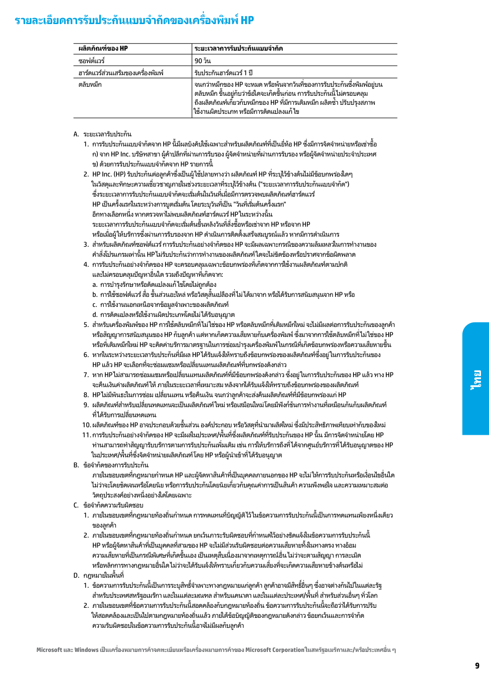 รายละเอียดการรับประกันแบบจɅำกัดของเครื่องพิมพ์ Hp