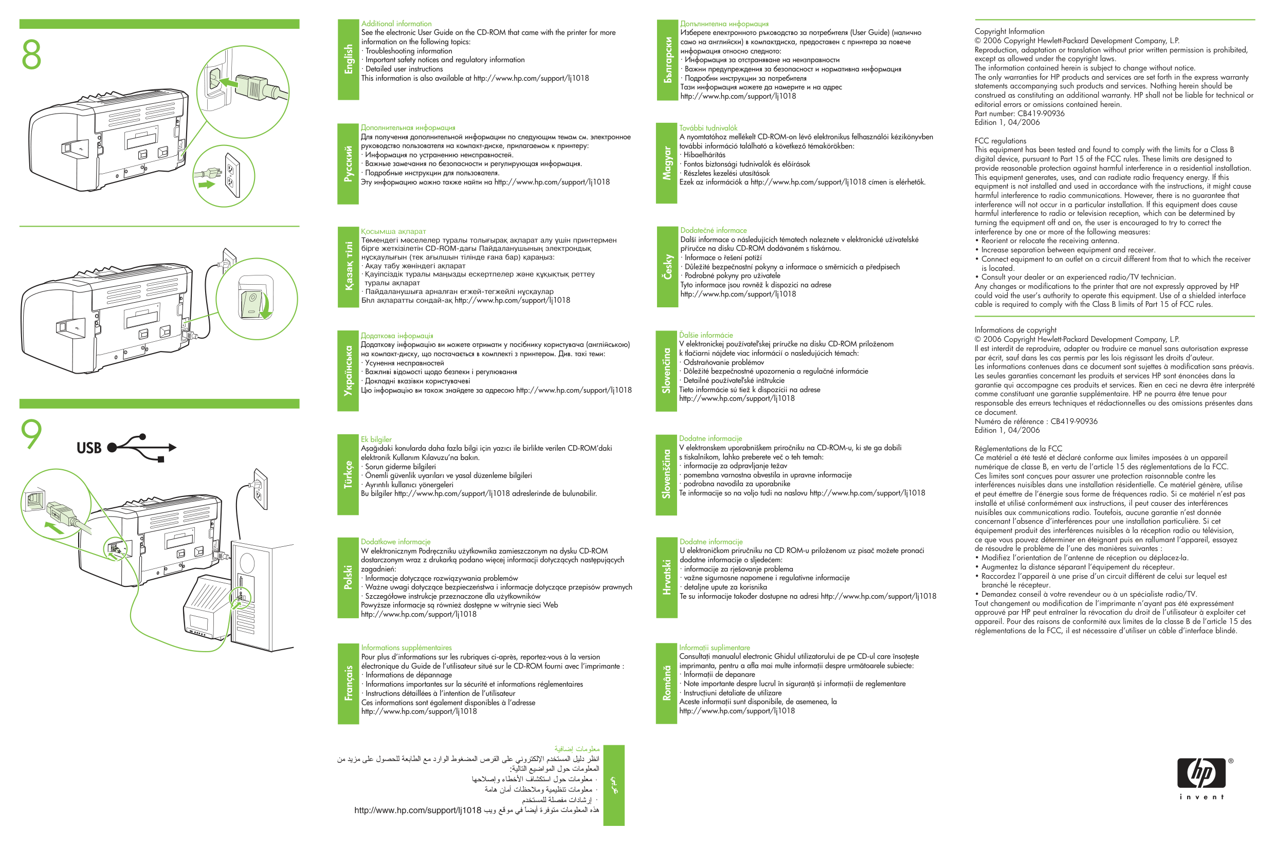 ! http://www.hp.com/support/lj1018 Copyright Information © 2006 Copyright Hewlett-Packard Development Company, L.P. Reproduction, adaptation or translation without prior written permission is prohibited, except as allowed under the copyright laws. The information contained herein is subject to change without notice. The only warranties for HP products and services are set forth in the express warranty statements accompanying such products and services. Nothing herein should be construed as constituting an additional warranty. HP shall not be liable for technical or editorial errors or omissions contained herein. Part number: CB419-90936 Edition 1, 04/2006 FCC regulations This equipment has been tested and found to comply with the limits for a Class B digital device, pursuant to Part 15 of the FCC rules. These limits are designed to provide reasonable protection against harmful interference in a residential installation. This equipment generates, uses, and can radiate radio frequency energy. If this equipment is not installed and used in accordance with the instructions, it might cause harmful interference to radio communications. However, there is no guarantee that interference will not occur in a particular installation. If this equipment does cause harmful interference to radio or television reception, which can be determined by turning the equipment off and on, the user is encouraged to try to correct the interference by one or more of the following measures: