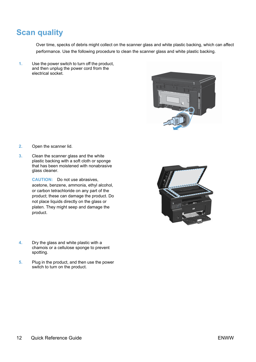 Do not use abrasives, acetone, benzene, ammonia, ethyl alcohol, or carbon tetrachloride on any part of the product; these can damage the product. Do not place liquids directly on the glass or platen. They might seep and damage the product.12 Quick Reference Guide