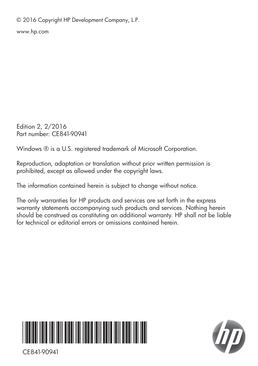 Fax from the document feeder 15© 2016 Copyright HP Development Company, L.P. www.hp.com Edition 2, 2/2016 Part number: CE841-90941 Windows ® is a U.S. registered trademark of Microsoft Corporation. Reproduction, adaptation or translation without prior written permission is prohibited, except as allowed under the copyright laws. The information contained herein is subject to change without notice. The only warranties for HP products and services are set forth in the express warranty statements accompanying such products and services. Nothing herein should be construed as constituting an additional warranty. HP shall not be liable for technical or editorial errors or omissions contained herein.