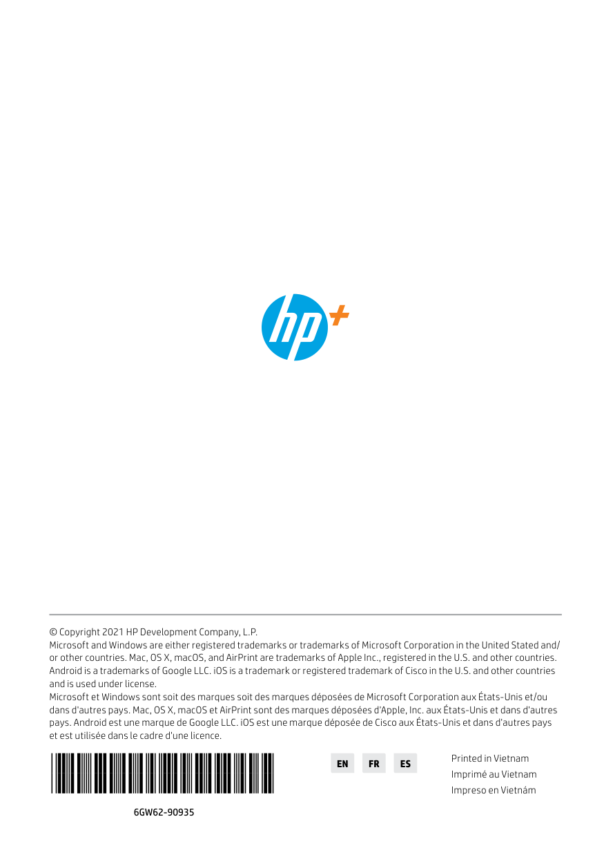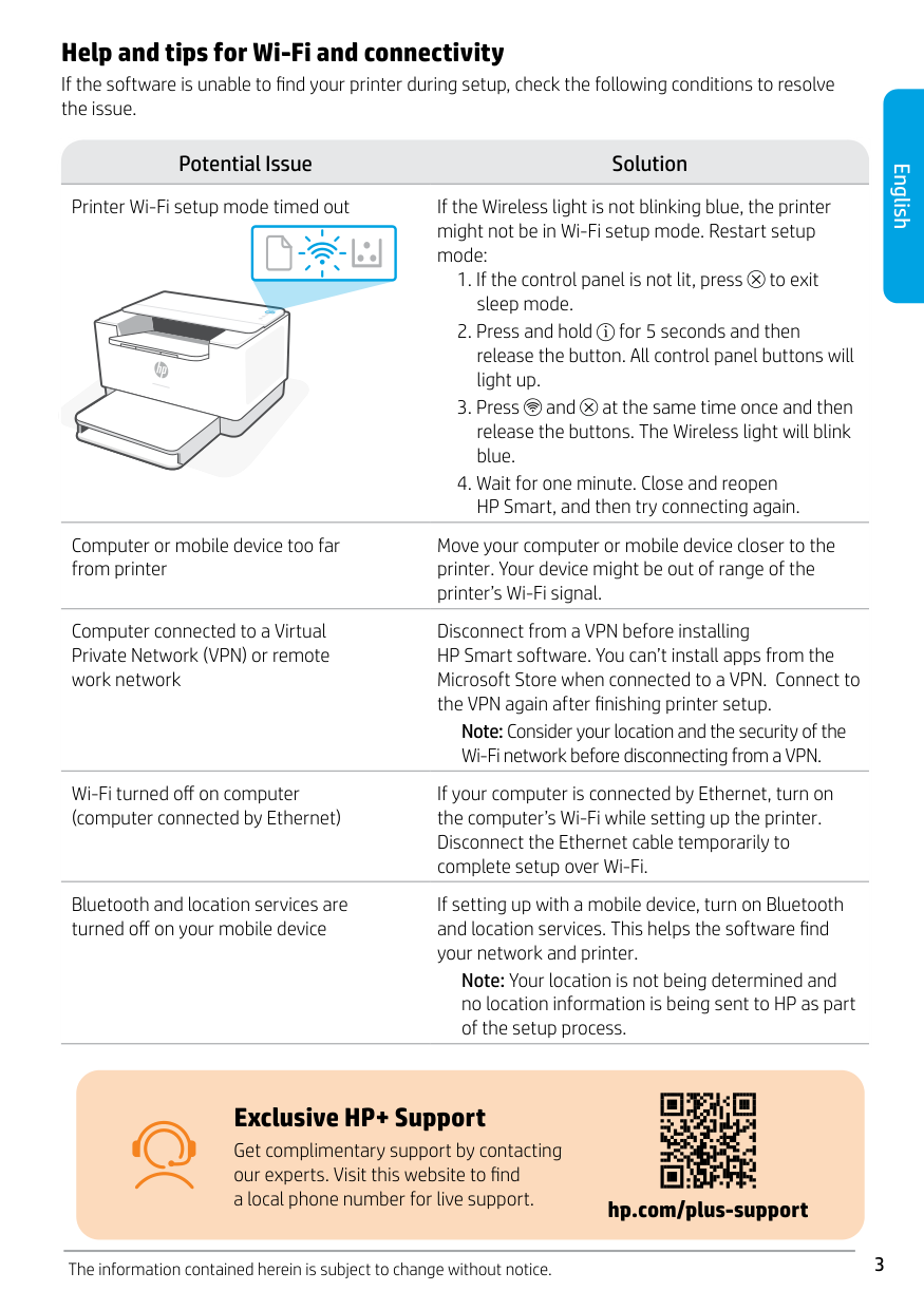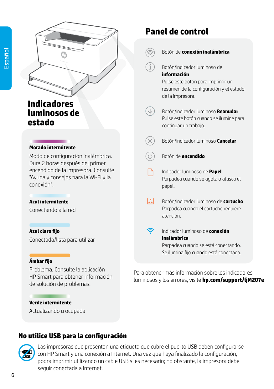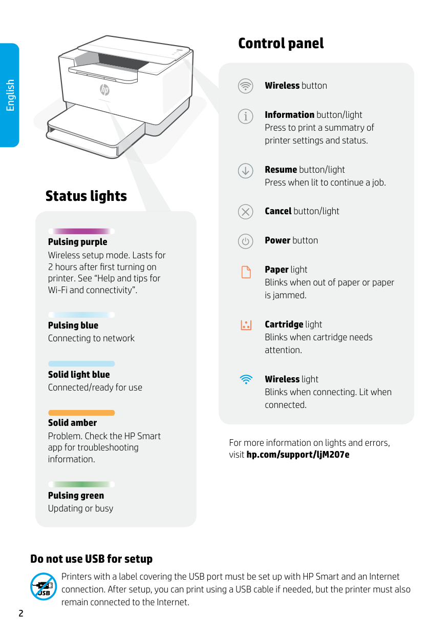 2 Control panel Wireless button Information button/light Press to print a summatry of printer settings and status. Resume button/light Press when lit to continue a job. Cancel button/light Power button Paper light Blinks when out of paper or paper is jammed. Cartridge light Blinks when cartridge needs attention. Wireless light Blinks when connecting. Lit when connected. Status lights Pulsing purple Wireless setup mode. Lasts for 2 hours after first turning on printer. See “Help and tips for Wi-Fi and connectivity”. Pulsing blue Connecting to network Solid light blue Connected/ready for use Solid amber Problem. Check the HP Smart app for troubleshooting information. Pulsing green Updating or busy Do not use USB for setup Printers with a label covering the USB port must be set up with HP Smart and an Internet connection. After setup, you can print using a USB cable if needed, but the printer must also remain connected to the Internet. For more information on lights and errors, visit hp.com/support/ljM207e English