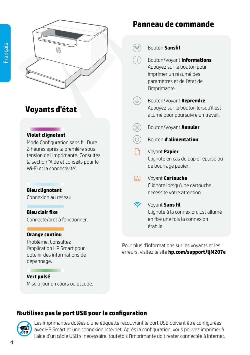 4 Panneau de commande Bouton Sansfil Bouton/Voyant Informations Appuyez sur le bouton pour imprimer un résumé des paramètres et de l'état de l'imprimante. Bouton/Voyant Reprendre Appuyez sur le bouton lorsqu'il est allumé pour poursuivre un travail. Bouton/Voyant Annuler Bouton d'alimentation Voyant Papier Clignote en cas de papier épuisé ou de bourrage papier. Voyant Cartouche Clignote lorsqu'une cartouche nécessite votre attention. Voyant Sans fil Clignote à la connexion. Est allumé en fixe une fois la connexion établie. Voyants d'état Violet clignotant Mode Configuration sans fil. Dure 2 heures après la première sous tension de l'imprimante. Consultez la section "Aide et conseils pour le Wi-Fi et la connectivité". Bleu clignotant Connexion au réseau. Bleu clair fixe Connecté/prêt à fonctionner. Orange continu Problème. Consultez l'application HP Smart pour obtenir des informations de dépannage. Vert pulsé Mise à jour en cours ou occupé. Pour plus d'informations sur les voyants et les erreurs, visitez le site hp.com/support/ljM207e N›utilisez pas le port USB pour la configuration Les imprimantes dotées d’une étiquette recouvrant le port USB doivent être configurées avec HP Smart et une connexion Internet. Après la configuration, vous pouvez imprimer à l’aide d’un câble USB si nécessaire, toutefois l’imprimante doit rester connectée à Internet. Français