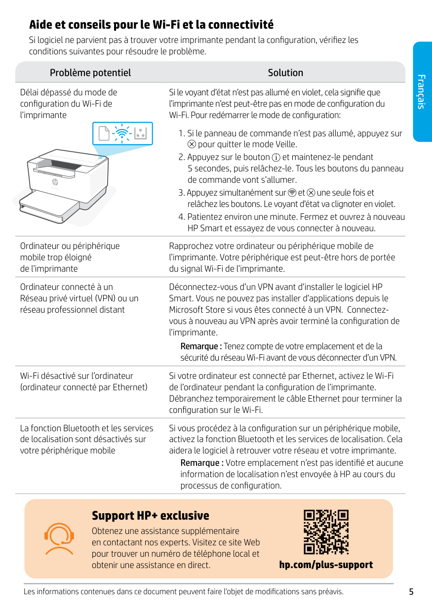 Français 5 Aide et conseils pour le Wi-Fi et la connectivité Si logiciel ne parvient pas à trouver votre imprimante pendant la configuration, vérifiez les conditions suivantes pour résoudre le problème. Les informations contenues dans ce document peuvent faire l’objet de modifications sans préavis. Problème potentiel Solution Délai dépassé du mode de configuration du Wi-Fi de l’imprimante Si le voyant d’état n’est pas allumé en violet, cela signifie que l’imprimante n’est peut-être pas en mode de configuration du Wi-Fi. Pour redémarrer le mode de configuration: