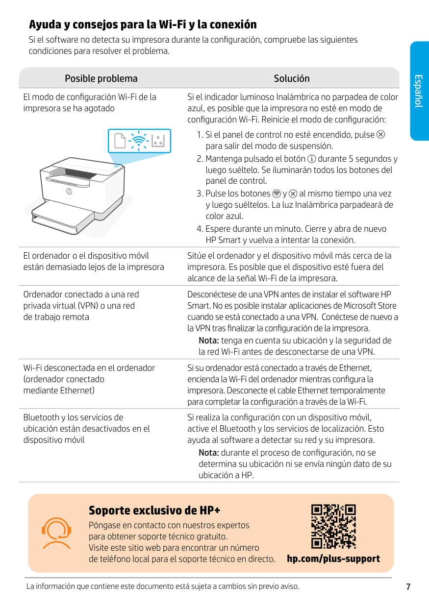 Español 7 Ayuda y consejos para la Wi-Fi y la conexión Si el software no detecta su impresora durante la configuración, compruebe las siguientes condiciones para resolver el problema. La información que contiene este documento está sujeta a cambios sin previo aviso. Posible problema Solución El modo de configuración Wi-Fi de la impresora se ha agotado Si el indicador luminoso Inalámbrica no parpadea de color azul, es posible que la impresora no esté en modo de configuración Wi-Fi. Reinicie el modo de configuración: