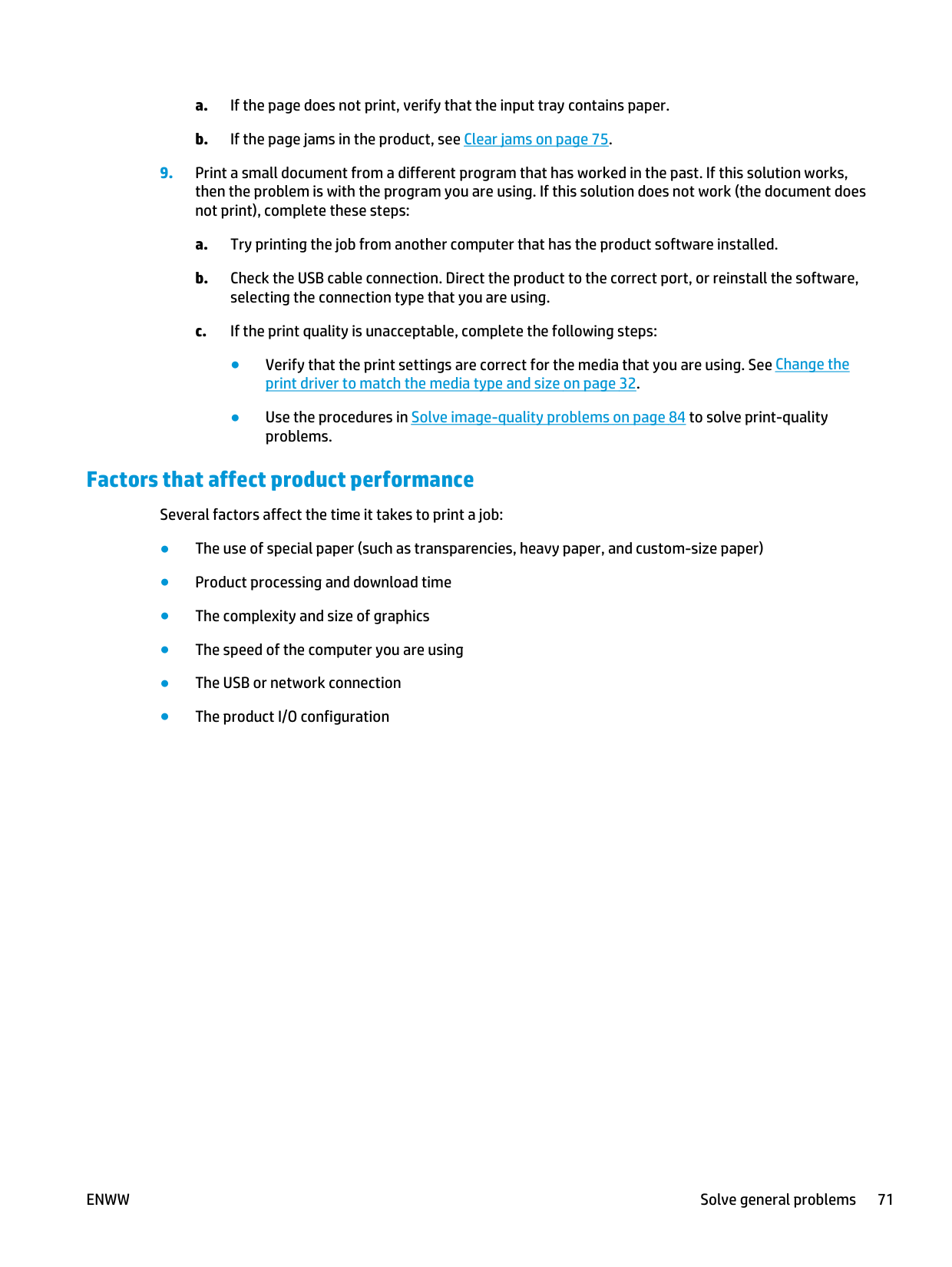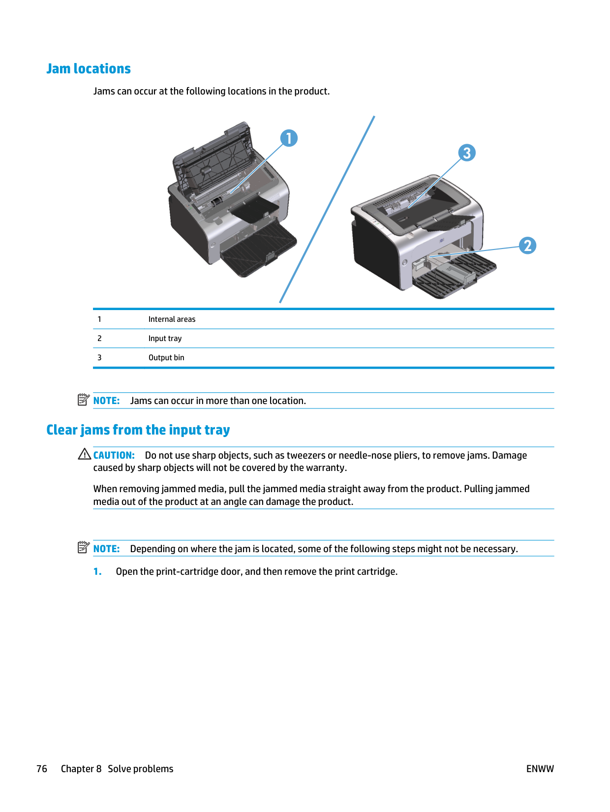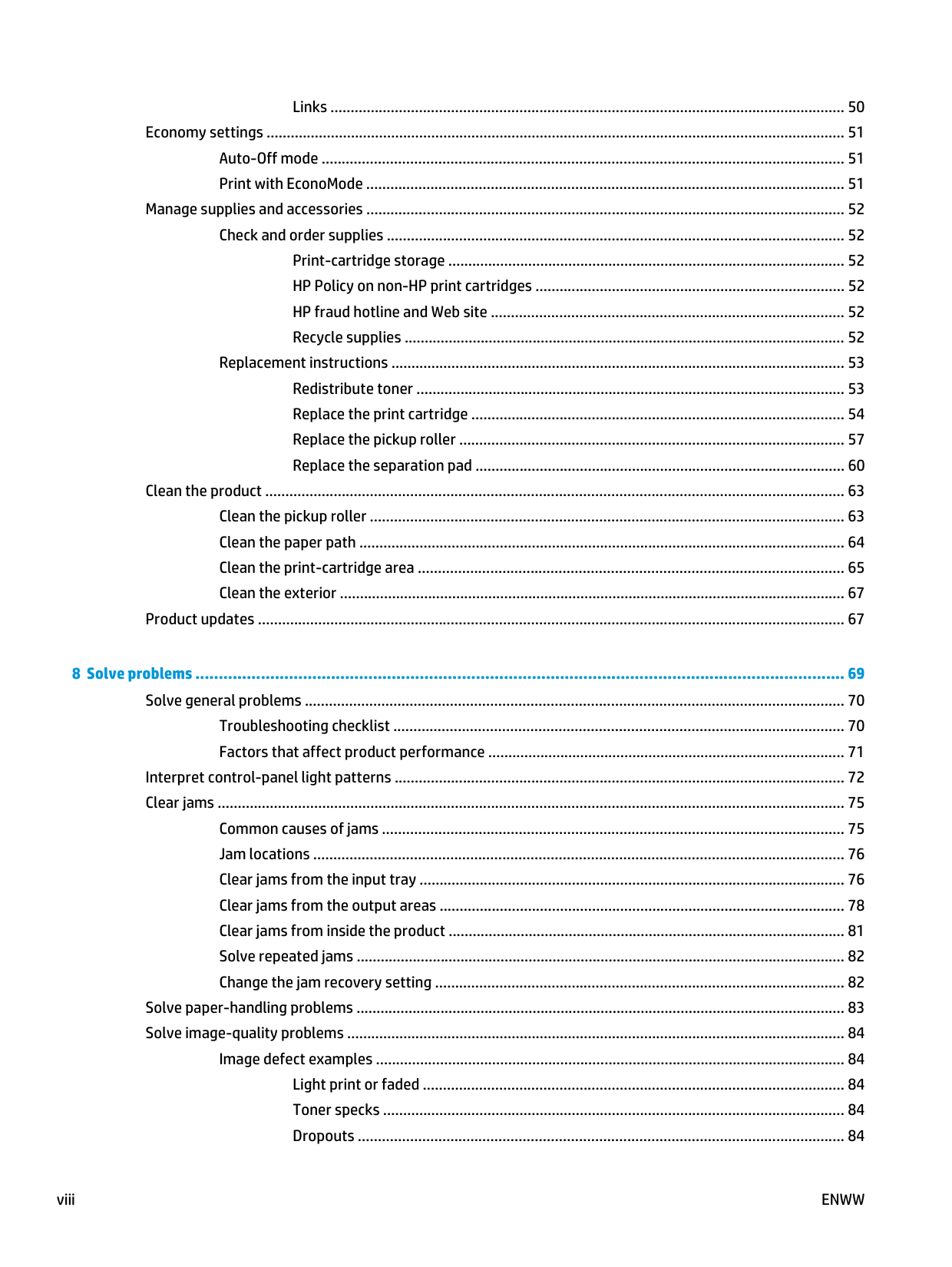viiLinks ................................................................................................................................ 50 Economy settings ................................................................................................................................................ 51 Auto-Off mode .................................................................................................................................. 51 Print with EconoMode ....................................................................................................................... 51 Manage supplies and accessories ....................................................................................................................... 52 Check and order supplies .................................................................................................................. 52 Print-cartridge storage ................................................................................................... 52 HP Policy on non-HP print cartridges ............................................................................. 52 HP fraud hotline and Web site ........................................................................................ 52 Recycle supplies .............................................................................................................. 52 Replacement instructions ................................................................................................................. 53 Redistribute toner ........................................................................................................... 53 Replace the print cartridge ............................................................................................. 54 Replace the pickup roller ................................................................................................ 57 Replace the separation pad ............................................................................................ 60 Clean the product ................................................................................................................................................ 63 Clean the pickup roller ...................................................................................................................... 63 Clean the paper path ......................................................................................................................... 64 Clean the print-cartridge area .......................................................................................................... 65 Clean the exterior .............................................................................................................................. 67 Product updates .................................................................................................................................................. 67 8 Solve problems ........................................................................................................................................... 69 Solve general problems ...................................................................................................................................... 70 Troubleshooting checklist ................................................................................................................ 70 Factors that affect product performance ......................................................................................... 71 Interpret control-panel light patterns ................................................................................................................ 72 Clear jams ............................................................................................................................................................ 75 Common causes of jams ................................................................................................................... 75 Jam locations .................................................................................................................................... 76 Clear jams from the input tray .......................................................................................................... 76 Clear jams from the output areas ..................................................................................................... 78 Clear jams from inside the product ................................................................................................... 81 Solve repeated jams .......................................................................................................................... 82 Change the jam recovery setting ...................................................................................................... 82 Solve paper-handling problems .......................................................................................................................... 83 Solve image-quality problems ............................................................................................................................ 84 Image defect examples ..................................................................................................................... 84 Light print or faded ......................................................................................................... 84 Toner specks ................................................................................................................... 84 Dropouts ......................................................................................................................... 84 viii