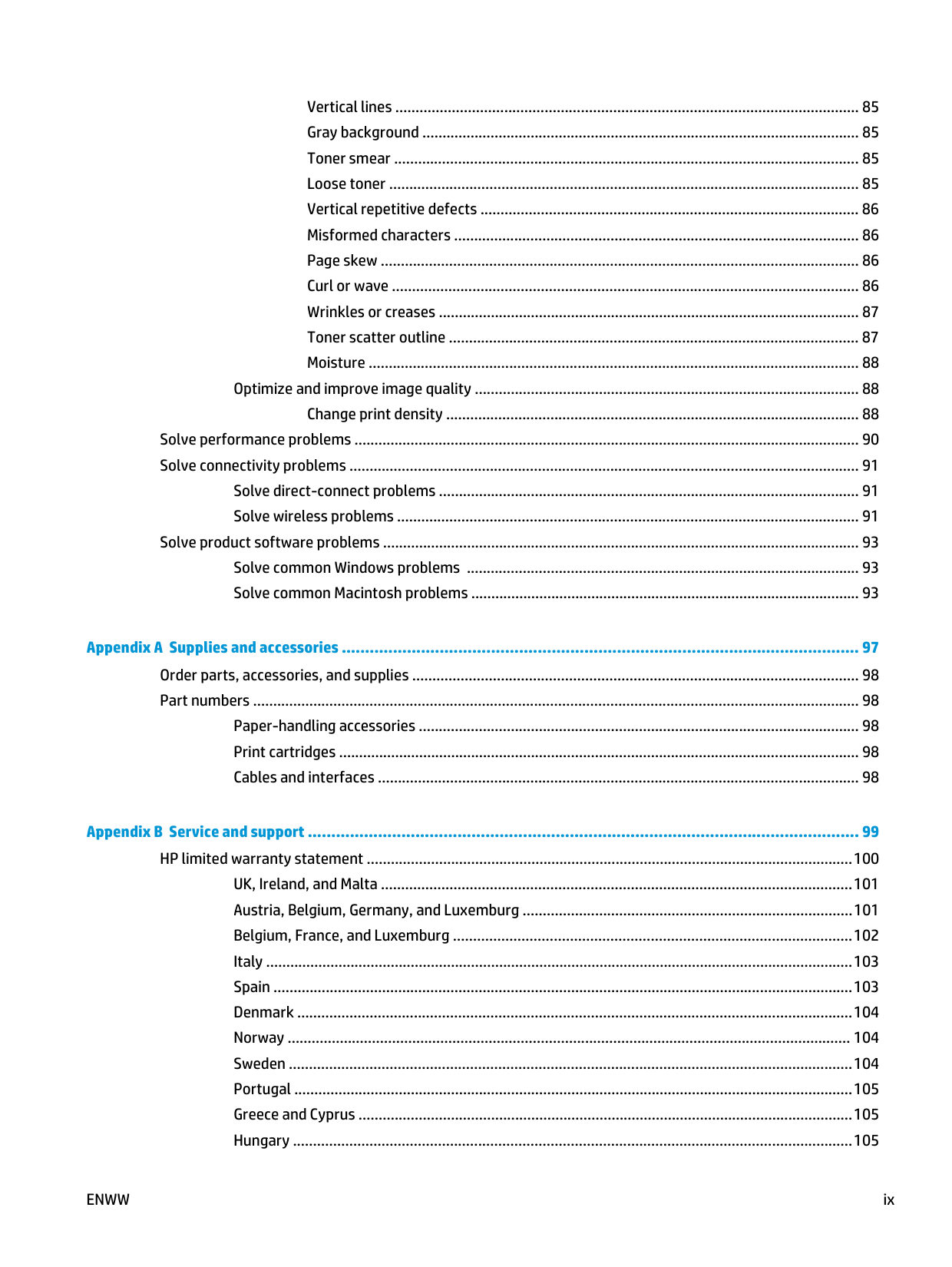 Vertical lines ................................................................................................................... 85 Gray background ............................................................................................................. 85 Toner smear .................................................................................................................... 85 Loose toner ..................................................................................................................... 85 Vertical repetitive defects .............................................................................................. 86 Misformed characters ..................................................................................................... 86 Page skew ....................................................................................................................... 86 Curl or wave .................................................................................................................... 86 Wrinkles or creases ......................................................................................................... 87 Toner scatter outline ...................................................................................................... 87 Moisture .......................................................................................................................... 88 Optimize and improve image quality ................................................................................................ 88 Change print density ....................................................................................................... 88 Solve performance problems .............................................................................................................................. 90 Solve connectivity problems ............................................................................................................................... 91 Solve direct-connect problems ......................................................................................................... 91 Solve wireless problems ................................................................................................................... 91 Solve product software problems ....................................................................................................................... 93 Solve common Windows problems .................................................................................................. 93 Solve common Macintosh problems ................................................................................................. 93 Appendix A Supplies and accessories ............................................................................................................... 97 Order parts, accessories, and supplies ............................................................................................................... 98 Part numbers ....................................................................................................................................................... 98 Paper-handling accessories .............................................................................................................. 98 Print cartridges .................................................................................................................................. 98 Cables and interfaces ........................................................................................................................ 98 Appendix B Service and support ...................................................................................................................... 99 HP limited warranty statement ......................................................................................................................... 100 UK, Ireland, and Malta ..................................................................................................................... 101 Austria, Belgium, Germany, and Luxemburg .................................................................................. 101 Belgium, France, and Luxemburg ................................................................................................... 102 Italy .................................................................................................................................................. 103 Spain ................................................................................................................................................ 103 Denmark .......................................................................................................................................... 104 Norway ............................................................................................................................................ 104 Sweden ............................................................................................................................................ 104 Portugal ........................................................................................................................................... 105 Greece and Cyprus ........................................................................................................................... 105 Hungary ........................................................................................................................................... 105