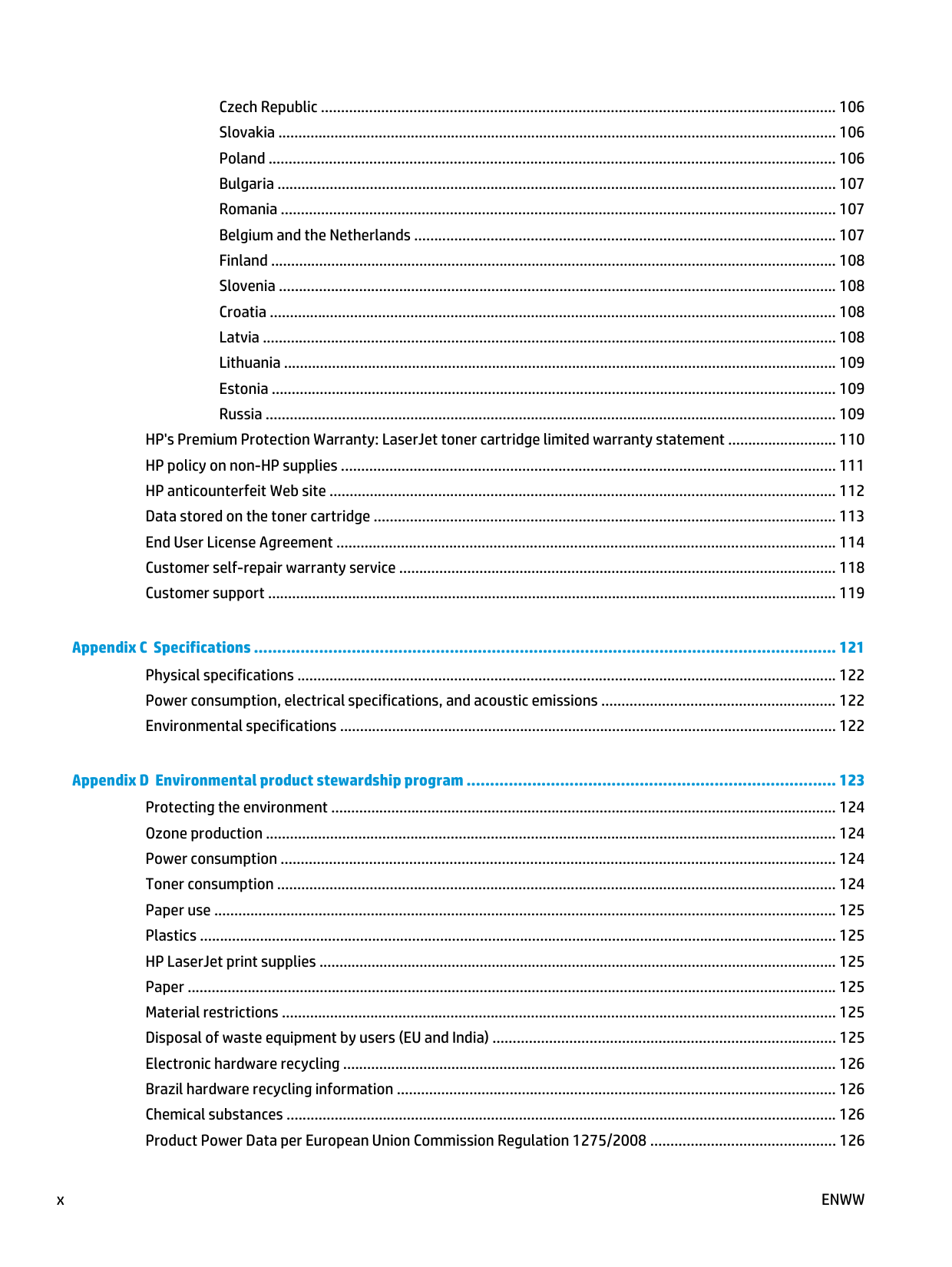 ixCzech Republic ................................................................................................................................ 106 Slovakia ........................................................................................................................................... 106 Poland ............................................................................................................................................. 106 Bulgaria ........................................................................................................................................... 107 Romania .......................................................................................................................................... 107 Belgium and the Netherlands ......................................................................................................... 107 Finland ............................................................................................................................................. 108 Slovenia ........................................................................................................................................... 108 Croatia ............................................................................................................................................. 108 Latvia ............................................................................................................................................... 108 Lithuania .......................................................................................................................................... 109 Estonia ............................................................................................................................................. 109 Russia .............................................................................................................................................. 109 HP's Premium Protection Warranty: LaserJet toner cartridge limited warranty statement ........................... 110 HP policy on non-HP supplies ........................................................................................................................... 111 HP anticounterfeit Web site .............................................................................................................................. 112 Data stored on the toner cartridge ................................................................................................................... 113 End User License Agreement ............................................................................................................................ 114 Customer self-repair warranty service ............................................................................................................. 118 Customer support .............................................................................................................................................. 119 Appendix C Specifications ............................................................................................................................. 121 Physical specifications ...................................................................................................................................... 122 Power consumption, electrical specifications, and acoustic emissions .......................................................... 122 Environmental specifications ............................................................................................................................ 122 Appendix D Environmental product stewardship program ............................................................................... 123 Protecting the environment .............................................................................................................................. 124 Ozone production .............................................................................................................................................. 124 Power consumption .......................................................................................................................................... 124 Toner consumption ........................................................................................................................................... 124 Paper use ........................................................................................................................................................... 125 Plastics ............................................................................................................................................................... 125 HP LaserJet print supplies ................................................................................................................................. 125 Paper .................................................................................................................................................................. 125 Material restrictions .......................................................................................................................................... 125 Disposal of waste equipment by users (EU and India) ..................................................................................... 125 Electronic hardware recycling ........................................................................................................................... 126 Brazil hardware recycling information ............................................................................................................. 126 Chemical substances ......................................................................................................................................... 126 Product Power Data per European Union Commission Regulation 1275/2008 .............................................. 