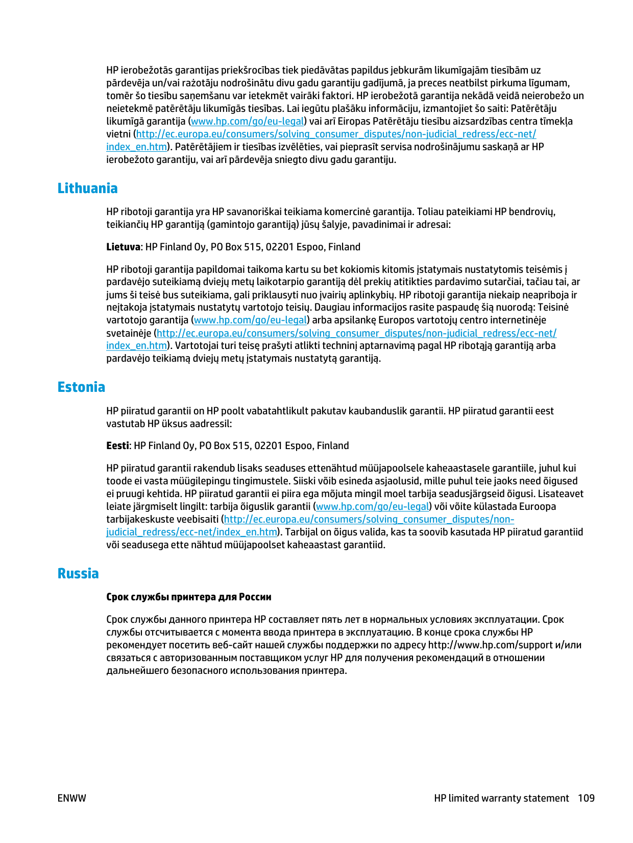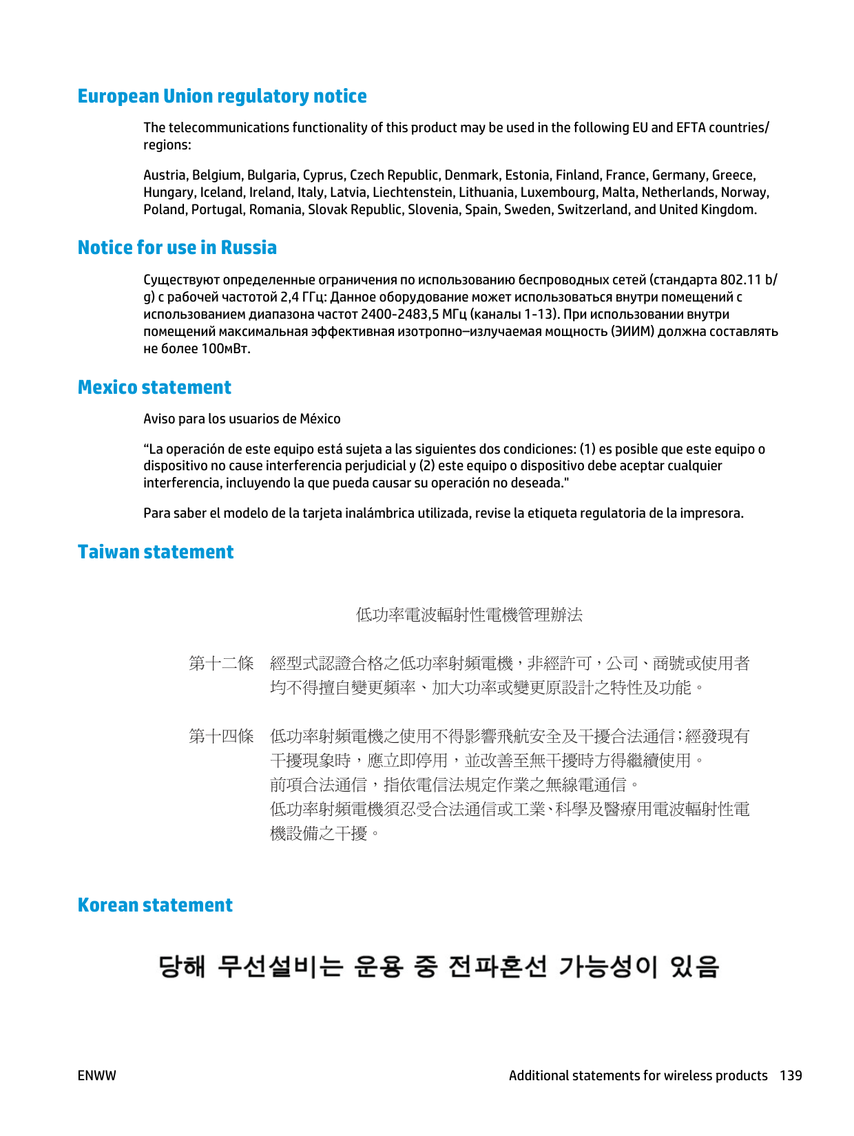 European Union regulatory notice The telecommunications functionality of this product may be used in the following EU and EFTA countries/ regions: Austria, Belgium, Bulgaria, Cyprus, Czech Republic, Denmark, Estonia, Finland, France, Germany, Greece, Hungary, Iceland, Ireland, Italy, Latvia, Liechtenstein, Lithuania, Luxembourg, Malta, Netherlands, Norway, Poland, Portugal, Romania, Slovak Republic, Slovenia, Spain, Sweden, Switzerland, and United Kingdom. Notice for use in Russia Существуют определенные ограничения по использованию беспроводных сетей (стандарта 802.11 b/ g) с рабочей частотой 2,4 ГГц: Данное оборудование может использоваться внутри помещений с использованием диапазона частот 2400-2483,5 МГц (каналы 1-13). При использовании внутри помещений максимальная эффективная изотропно–излучаемая мощность (ЭИИМ) должна составлять не более 100мВт. Mexico statement Aviso para los usuarios de México “La operación de este equipo está sujeta a las siguientes dos condiciones: (1) es posible que este equipo o dispositivo no cause interferencia perjudicial y (2) este equipo o dispositivo debe aceptar cualquier interferencia, incluyendo la que pueda causar su operación no deseada." Para saber el modelo de la tarjeta inalámbrica utilizada, revise la etiqueta regulatoria de la impresora. Taiwan statement Korean statement